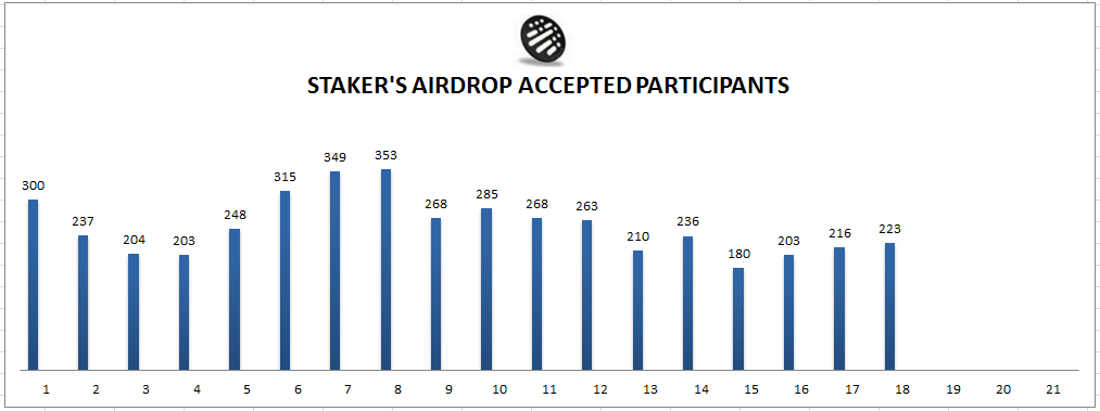 Great day guys!, today I’m going to share the Staker’s round 18 airdrop statistics based on my PERSONAL computation. October 22, 2018 at 5:22 AM in Coordinated Universal Time (UTC), the 18th airdrop round’s spreadsheet was released by Scatter one of the admins with 223 accepted participants. This week is 7 participants higher than last airdrop as graph stated below: