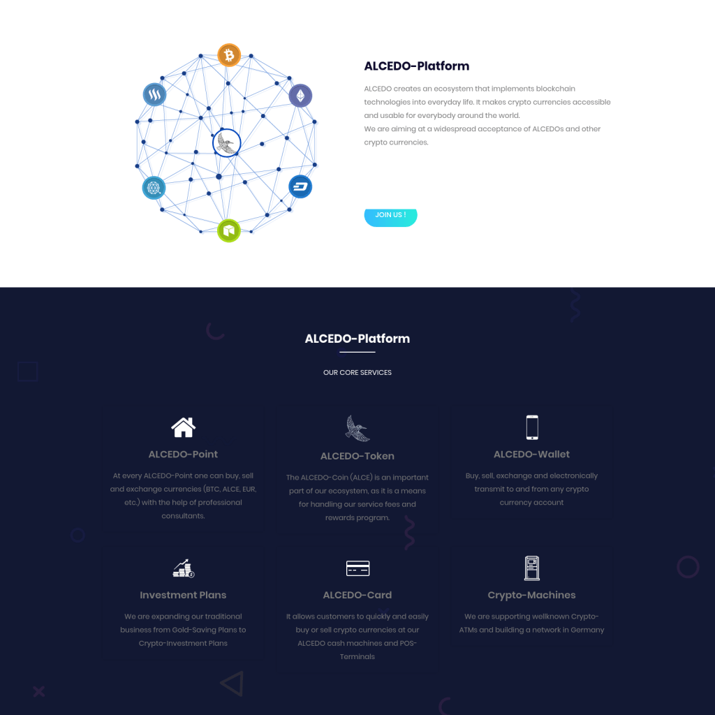 ALCEDO creates an ecosystem that integrates blockchain technology into everyday life. This makes cryptocurrency available and can be used by everyone in the world. Access to the ALCEDO platform only requires a smartphone and Internet access. Its mission is to provide customers with easy access to crypto currencies. Since 2016, we have developed and programed platforms with databases for savings plans, gold and cryptocurrency and have received very good market recognition. We offer interested parties, such as we believe or are interested in crypto currencies, as a method of payment in the near future, have smooth and transparent access using the ALCEDO platform. Our platform allows you to make cash or non-cash payments, and also supports all major crypto currencies. Look here: https://www.alcedoplatform.com/#whitepaper