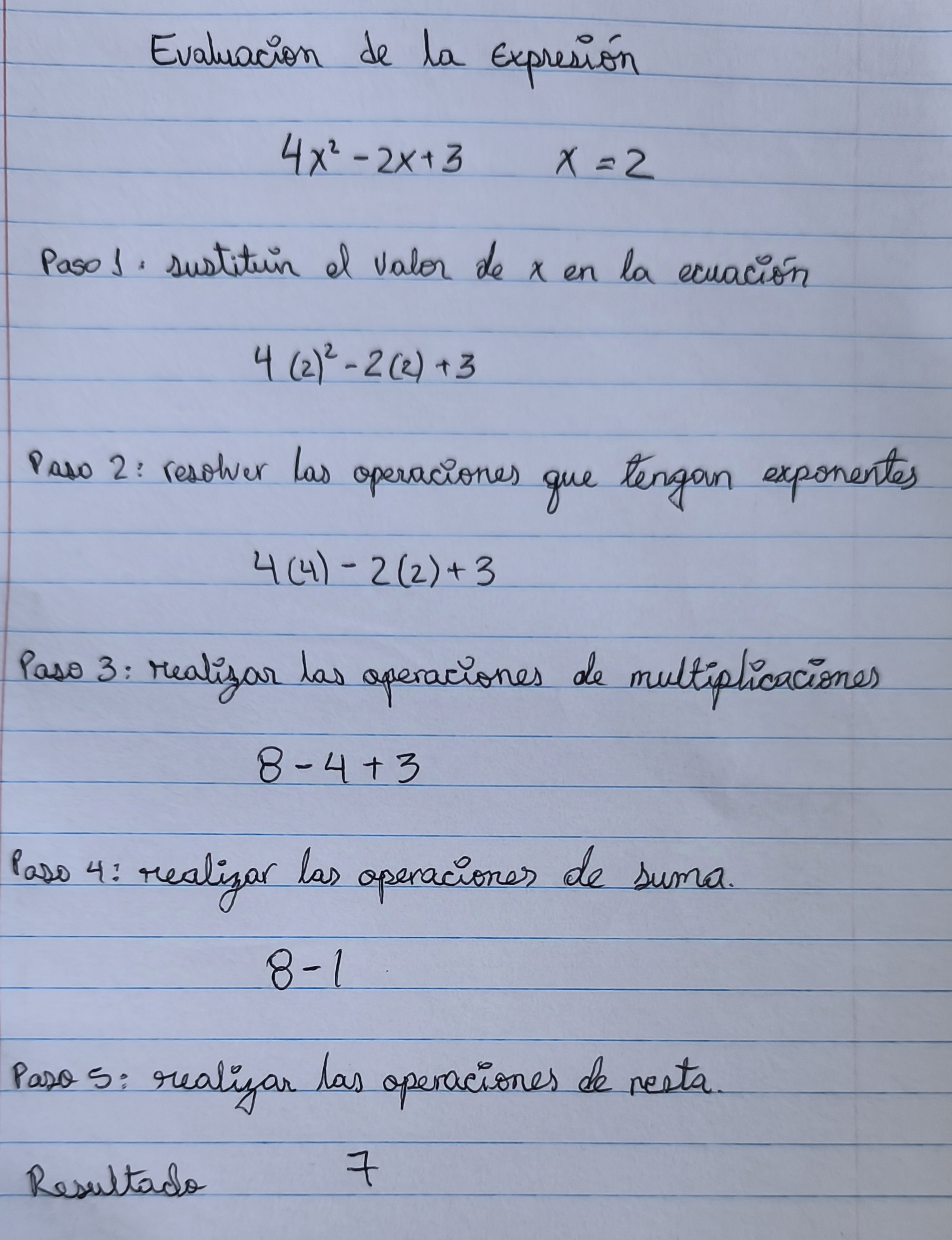 Tenemos la siguiente Expresión: 4x² - 2x + 3 y el valor de X=2