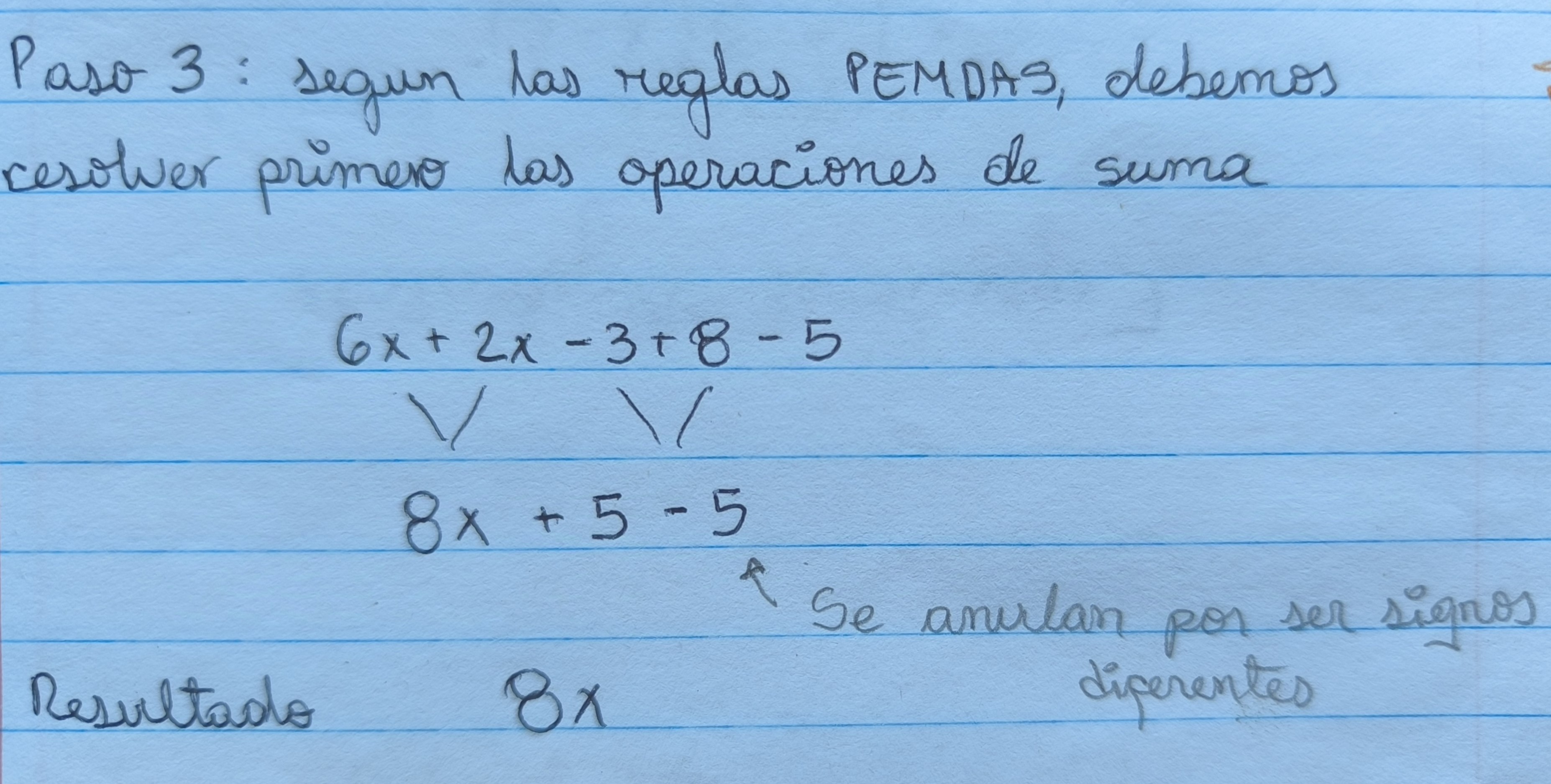 Paso 3: según el orden de prioridades indicado por las reglas PEMDAS, debemos calcular las operaciones de suma.