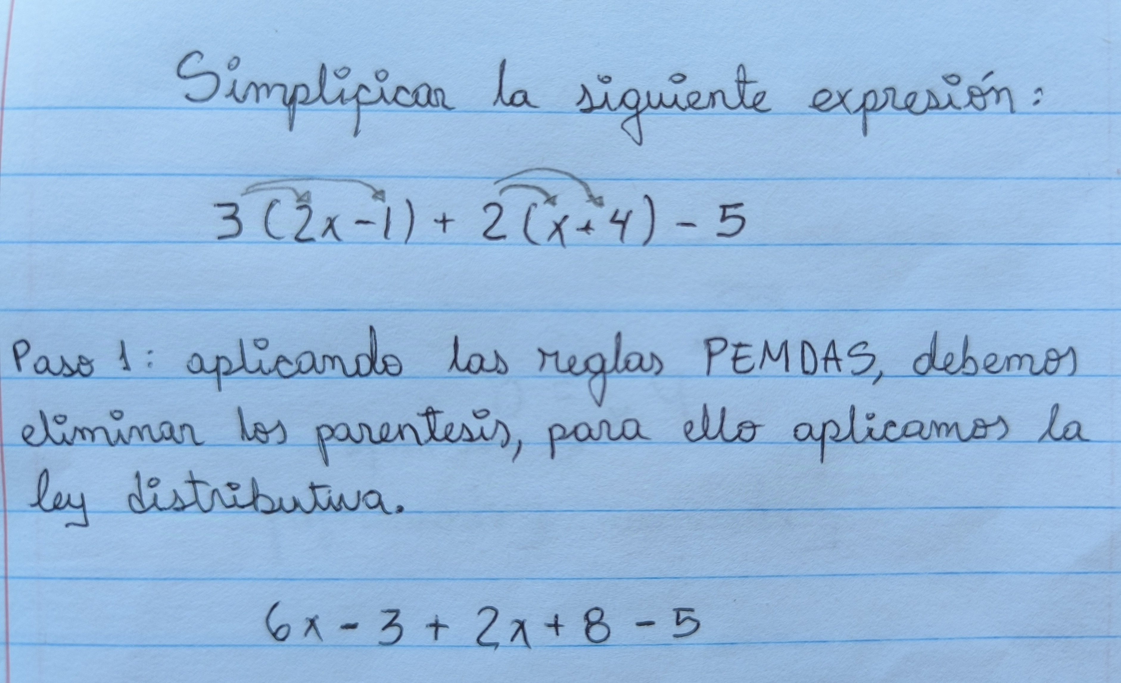Simplifica esta expresión: 3(2x - 1) + 2(x + 4) - 5