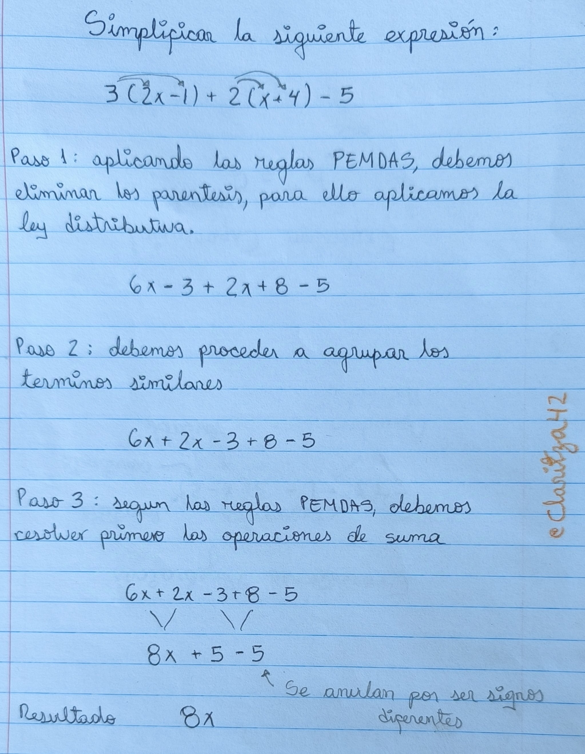 Paso 2: aplicando las reglas PEMDAS debemos resolver las operaciones en las cuales estén involucrados los paréntesis para eliminarlos.