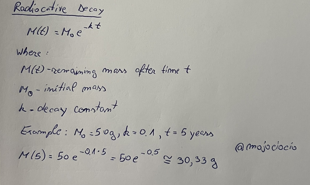 If we consider a initial mass M0 = 50g, the decay constant k = 0.1. After t = 5 years the mass will be: