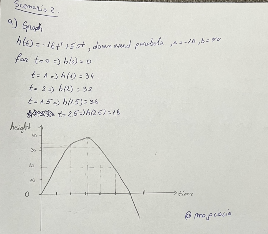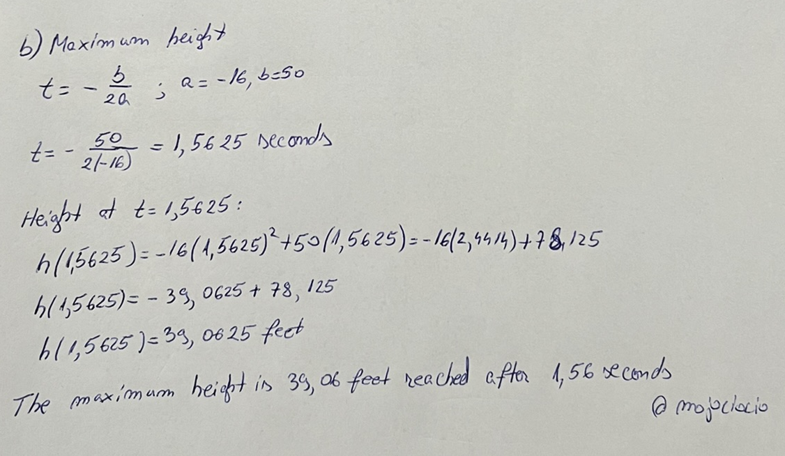 - t = 1.5 => h(1.5) = -16(1.5)^2 + 50(1.5) = 28