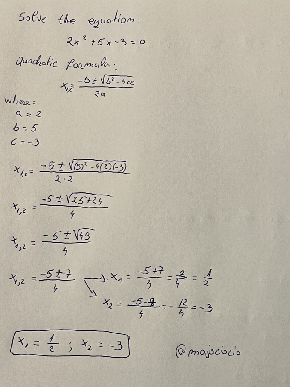 If we replace this in the formula, we get: x = (-5 ± √(5^2 - 4(2)(-3))) / 2(2). By raising to power and performing the multiplications and additions we have: x = (-5 ± √49) / 4. This becomes: x = (-5 ± 7)/4. - x1 = (-5 + 7)/4 = 2/4 = 1/2
