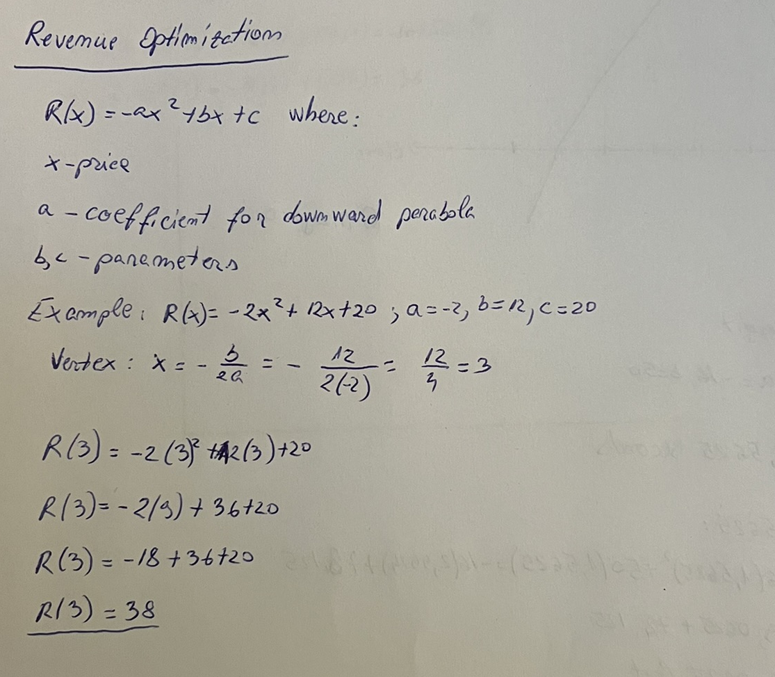 Let's take this example: R(x) = -2x^2 + 12x + 20, where x is the price.
