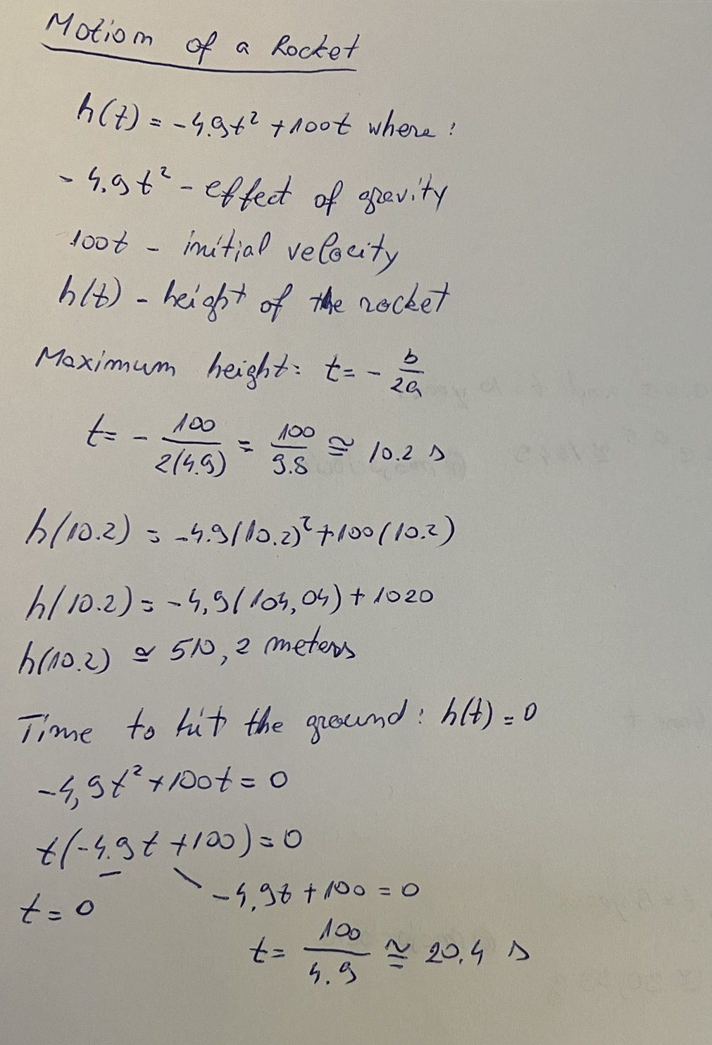 We can use quadratic functions to model the the motion of a rocket, the maximum height it will reach and after how much time it will return to ground.