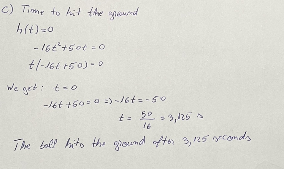 - t = 2.5 => h(2.5) = -16(2.5)^2 + 50(2.5) = 18