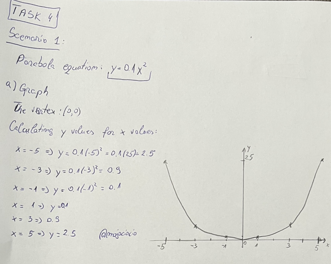I multiply the given equation y = 0.1x^2 by 10 and rewrite it as 10y = x^2, to help me in future calculations.