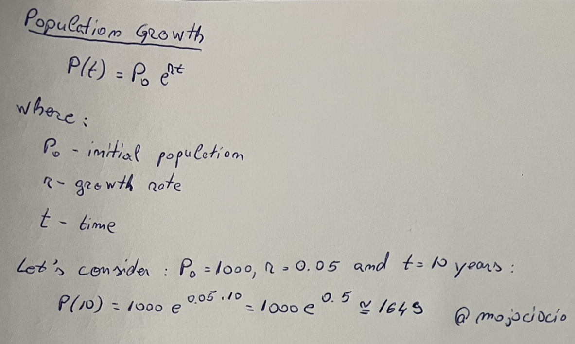 Population can grow at an exponential rate if we have unlimited resources. We can model it like this: P(t) = P0ert, where: