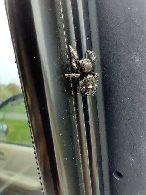 I looked in the back window of the car today and saw an interesting looking spider. My son and I got a close up look at the hairy arachnid.