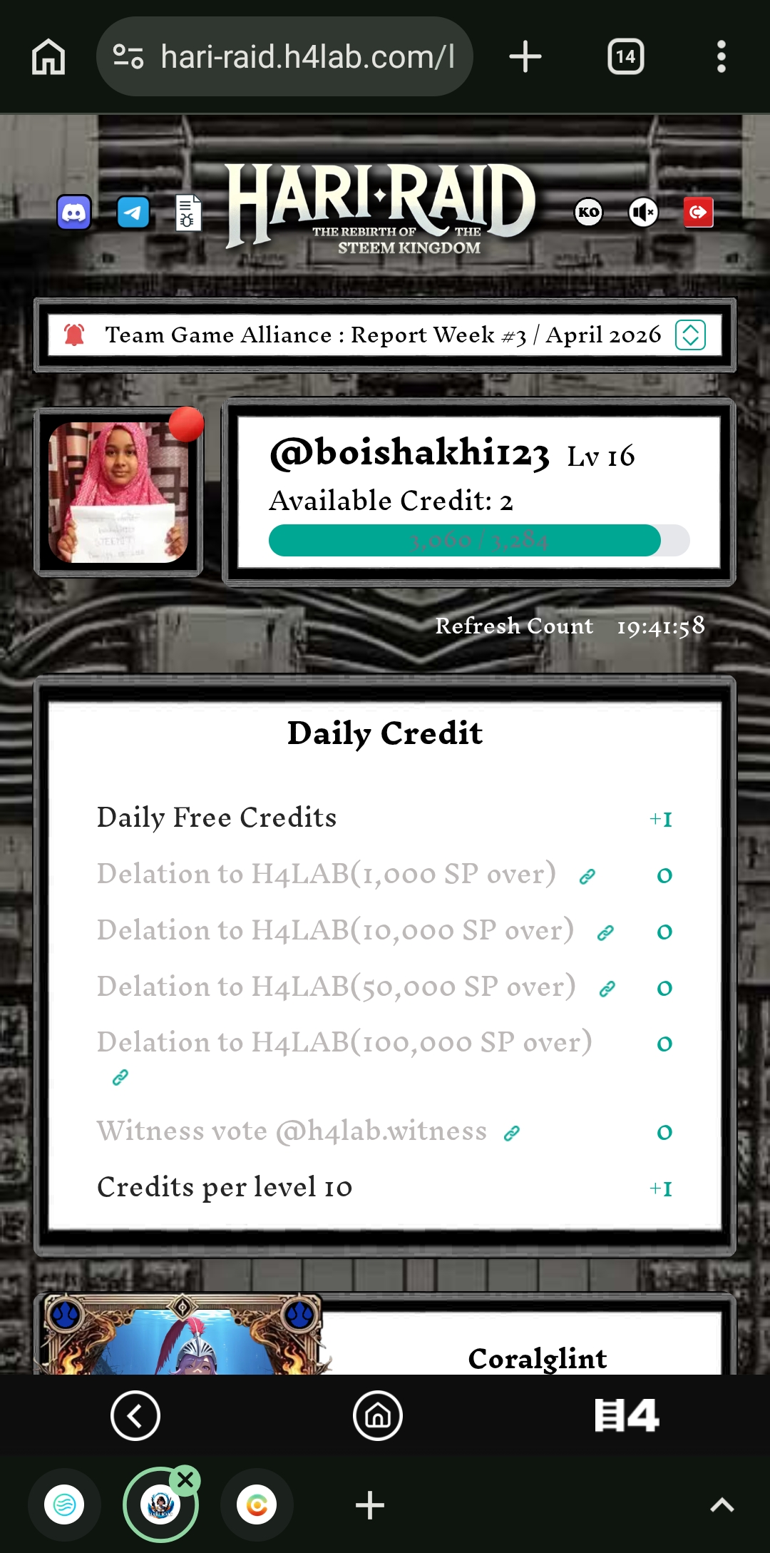 First I entered the game website and here I saw that I was level 16 and had available level credits of 2. Then I went down and saw that my rank was 104.