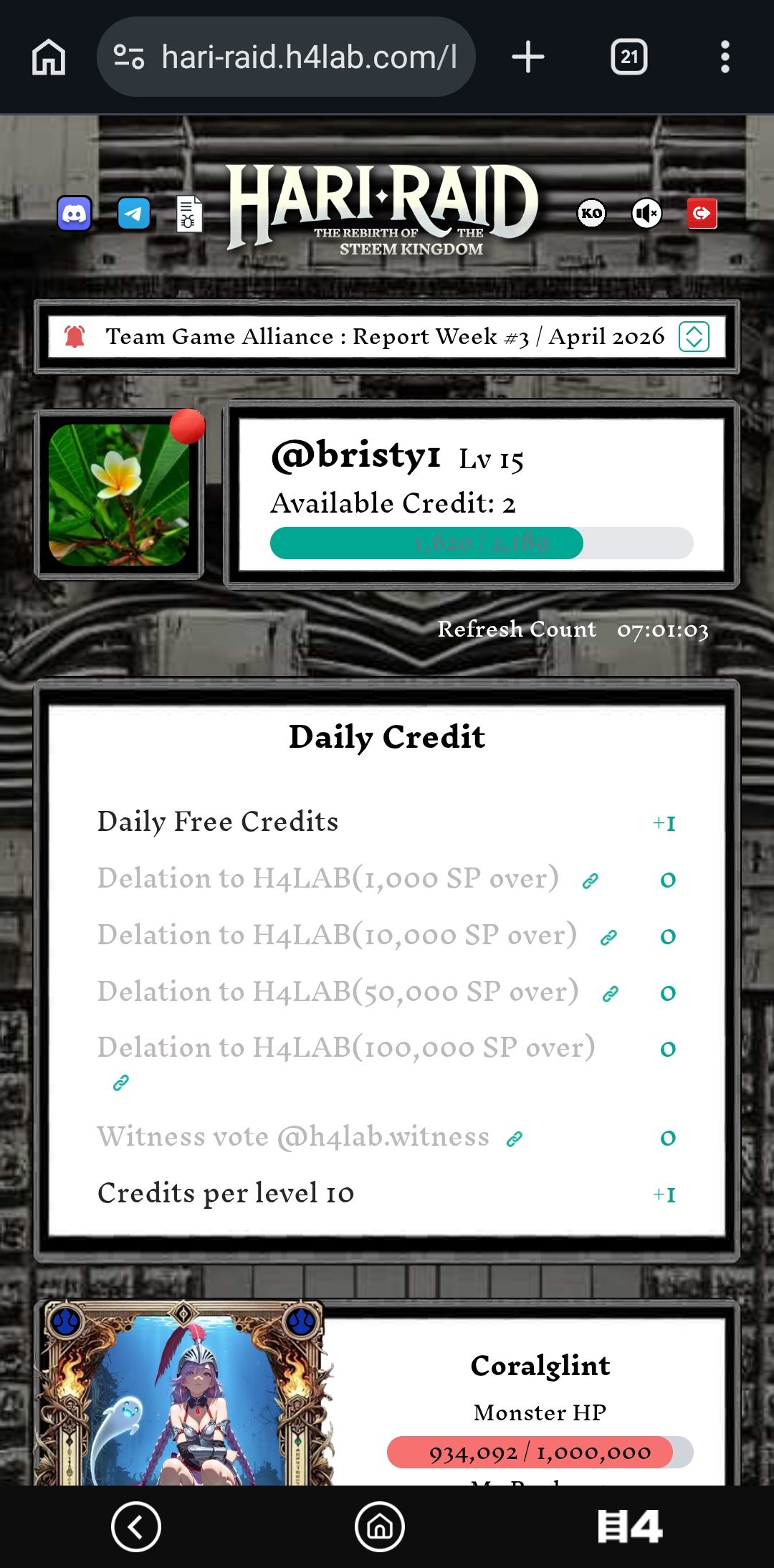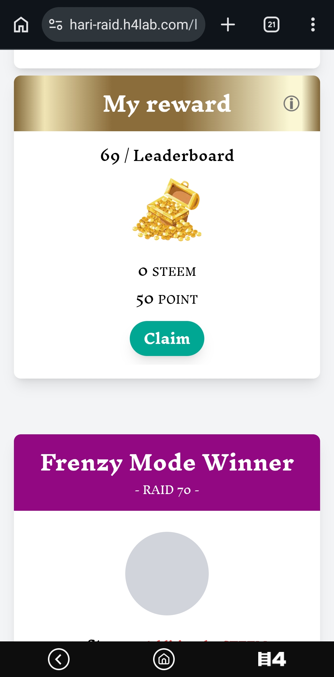 I played this hari raid game today .This is my 15th day of the game.My level was 15 and the credit was 2 . As usual, I claimed 10 points.Then I go to the leaderboard.There I claimed 50 points as reward.