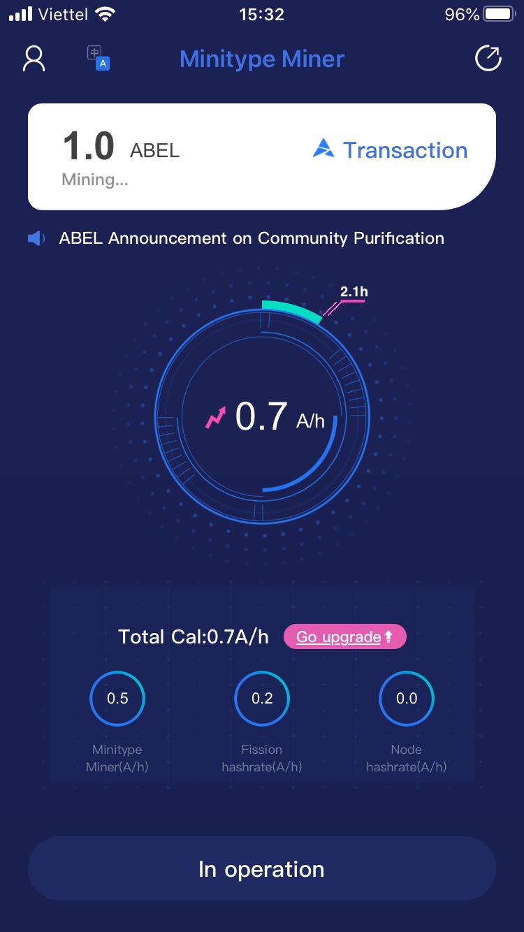 Once the registration is completed, it will be ABEL's voluntary mining tool, with a 24-hour hash rate of 0.5 A / H. ABEL funds are accumulated in an hourly personal account; This is the basic hash rate of everyone. By fissioning, users can upgrade their own mining machine. Every 21 days, the overall hash rate will increase; The operator's income will disappear to a certain stage, which will greatly benefit the security and administration of the entire network after the main network is launched in future centralization.All delicious App for free:
