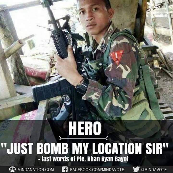 This time, sensing that death was more imminent than being rescued, he then gave his coordinates, and requested his commander to bomb his location so the enemies surrounding him will get hit too. “Bombahin nalang ninyo ang location ko Sir!,”(Just bomb my location Sir!) he told his commanding officer.