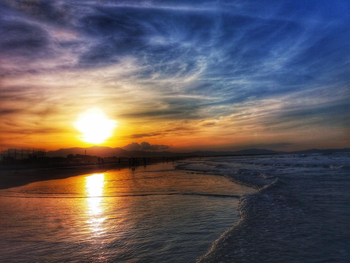 No matter how often we see a beautiful sunset, we always and always appreciate the glorious spectacle. Clouds scattered on the horizon add to the splendor as the setting sun bathes them in colorful splashes of red, violet, pink, orange, and yellow.