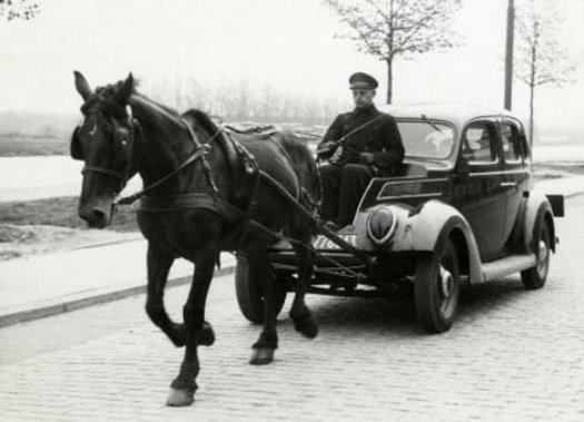 Maar nee, meneer de marketingdirecteur, snapt nog maar weinig van vernieuwing en probeert met een paard zijn moderne wagen voor te trekken.