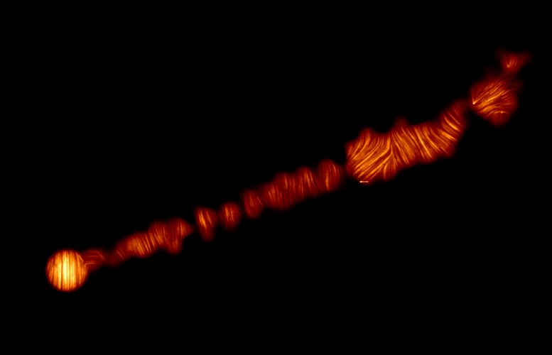 (This image shows a view of the jet in the Messier 87 (M87) galaxy in polarised light. The image was obtained with the Chile-based Atacama Large Millimeter/submillimeter Array (ALMA), in which ESO is a partner, and captures the part of the jet, with a size of 6000 light years, closer to the center of the galaxy. The lines mark the orientation of polarisation, which is related to the magnetic field in the region imaged. This ALMA image therefore indicates what the structure of the magnetic field along the jet looks like. Credit: ALMA (ESO/NAOJ/NRAO), Goddi et al.)