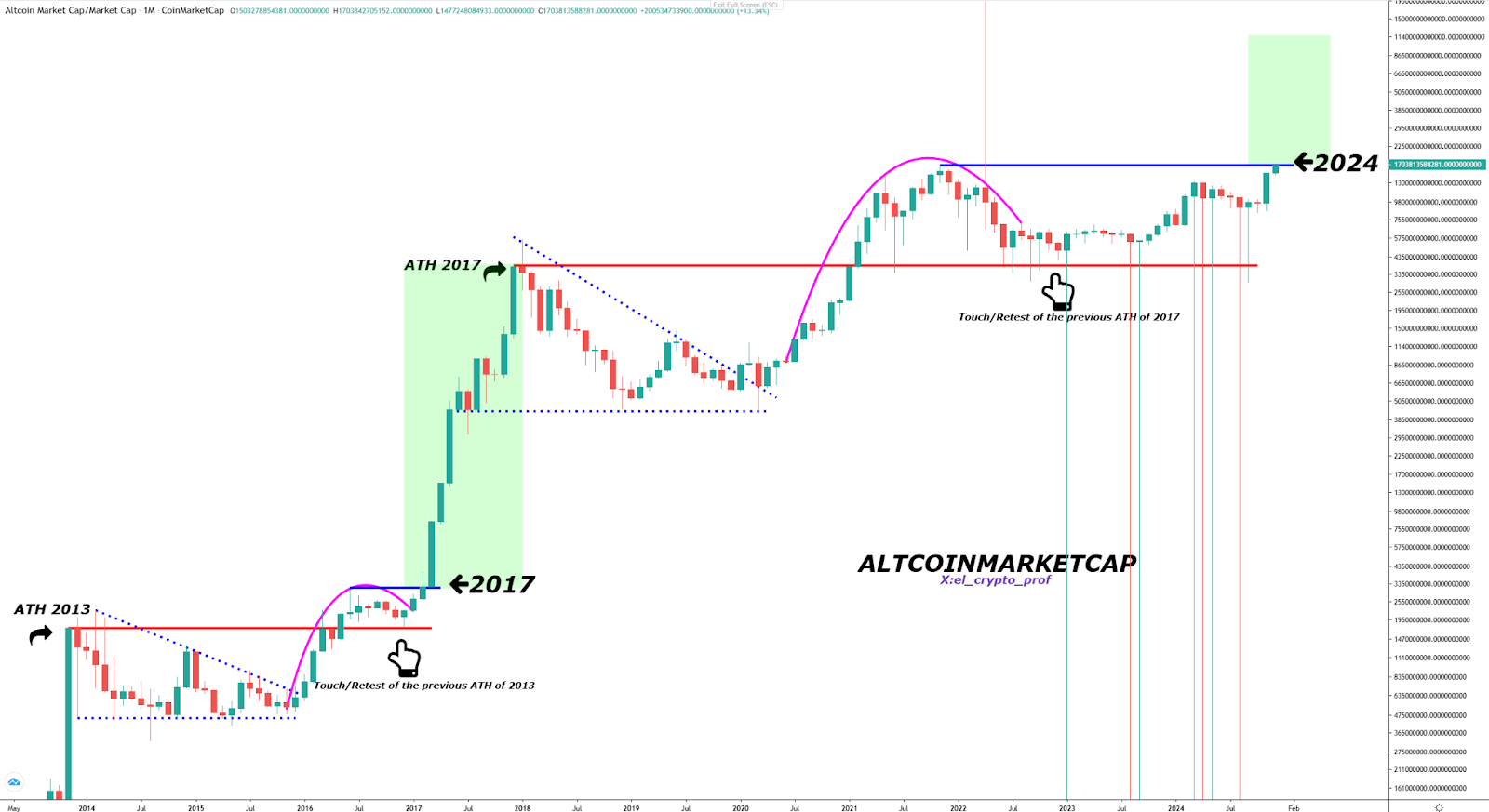 2013년 이후로 알트코인 시장은 명확한 패턴을 따랐습니다. 2013년에 처음으로 최고점(ATH)에 도달했지만, 그 후 하락하고 긴 수정을 거쳤습니다. 시간이 지남에 따라 시장은 안정되고 이전 최고점을 다시 테스트하여 이를 지지 수준으로 사용했습니다. 이는 2017년 엄청난 가격 상승의 토대를 마련했습니다. 그 해에 시장은 이전의 모든 기록을 깨고 역대 최대의 알트코인 붐을 일으켰습니다.