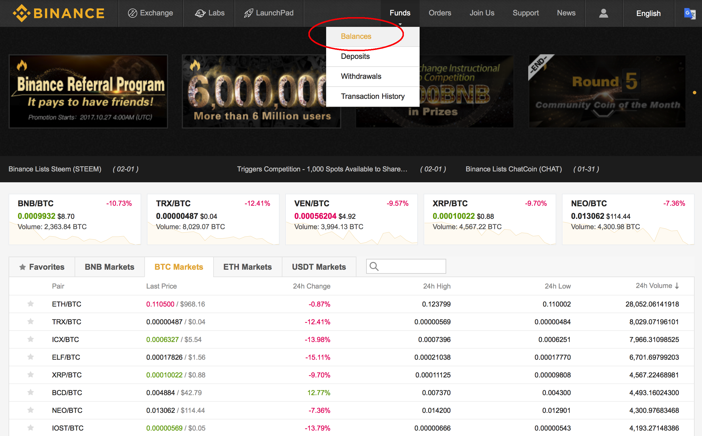 Now, that you have created an account you need to deposit. Depending on what you are about to do you need deposit the given cryptocurrency. For our introduction let's say we wanna buy some Altcoins with Ethereum. Therefor you need to open the funds tab and then click on deposit: