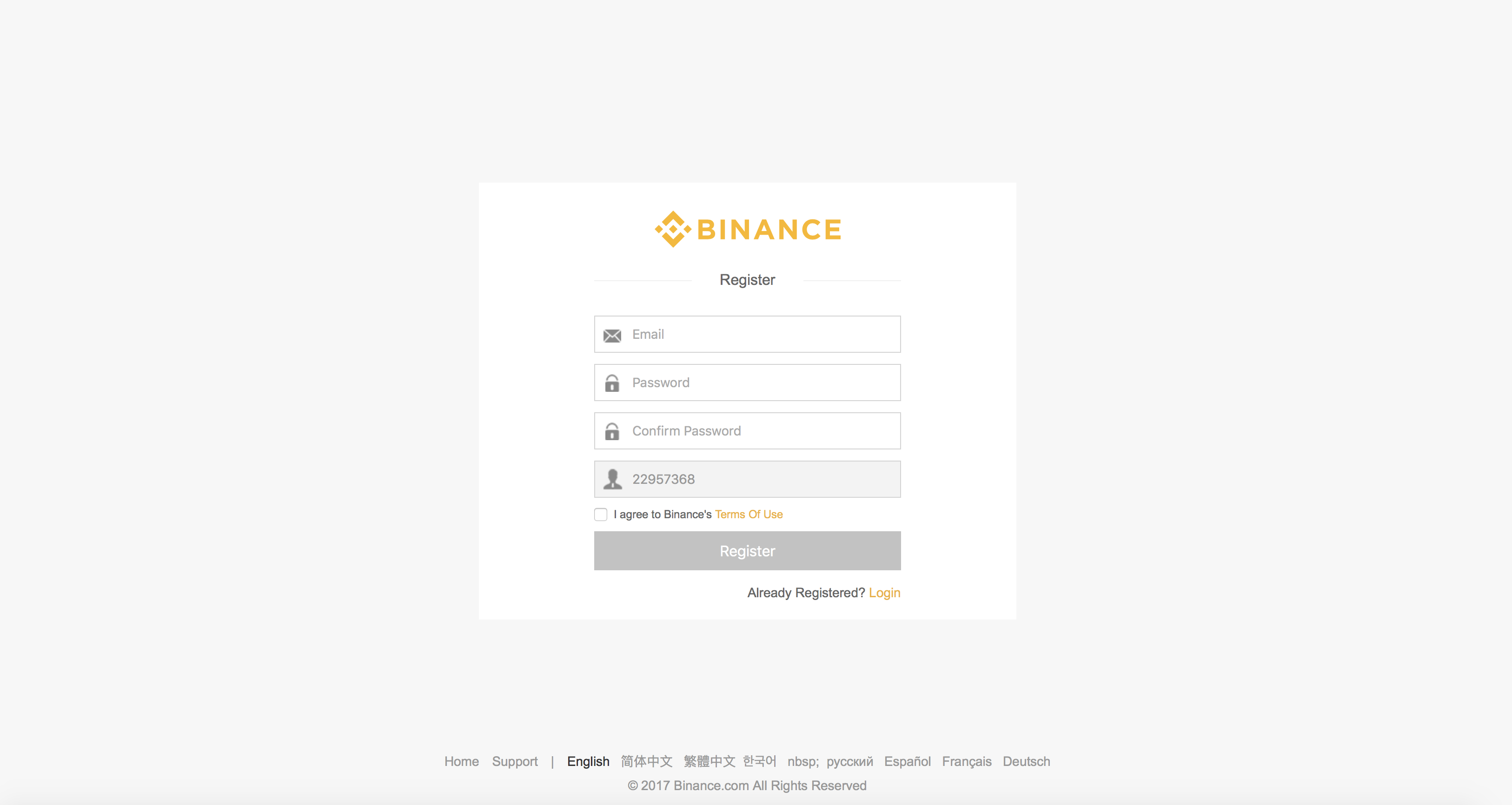By clicking here you will get to the Binance main page. Now you need to click register in upper right corner to get to the registration form: