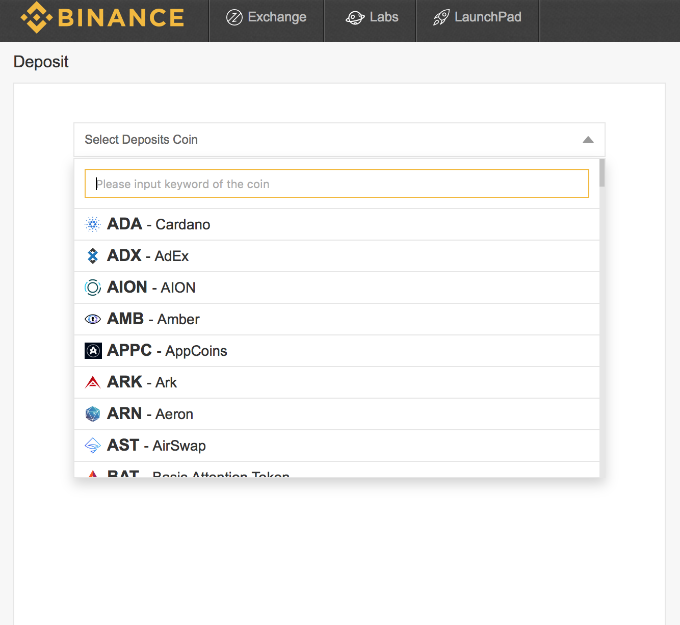 Now you need to search for Ethereum in the select deposits coin tab: