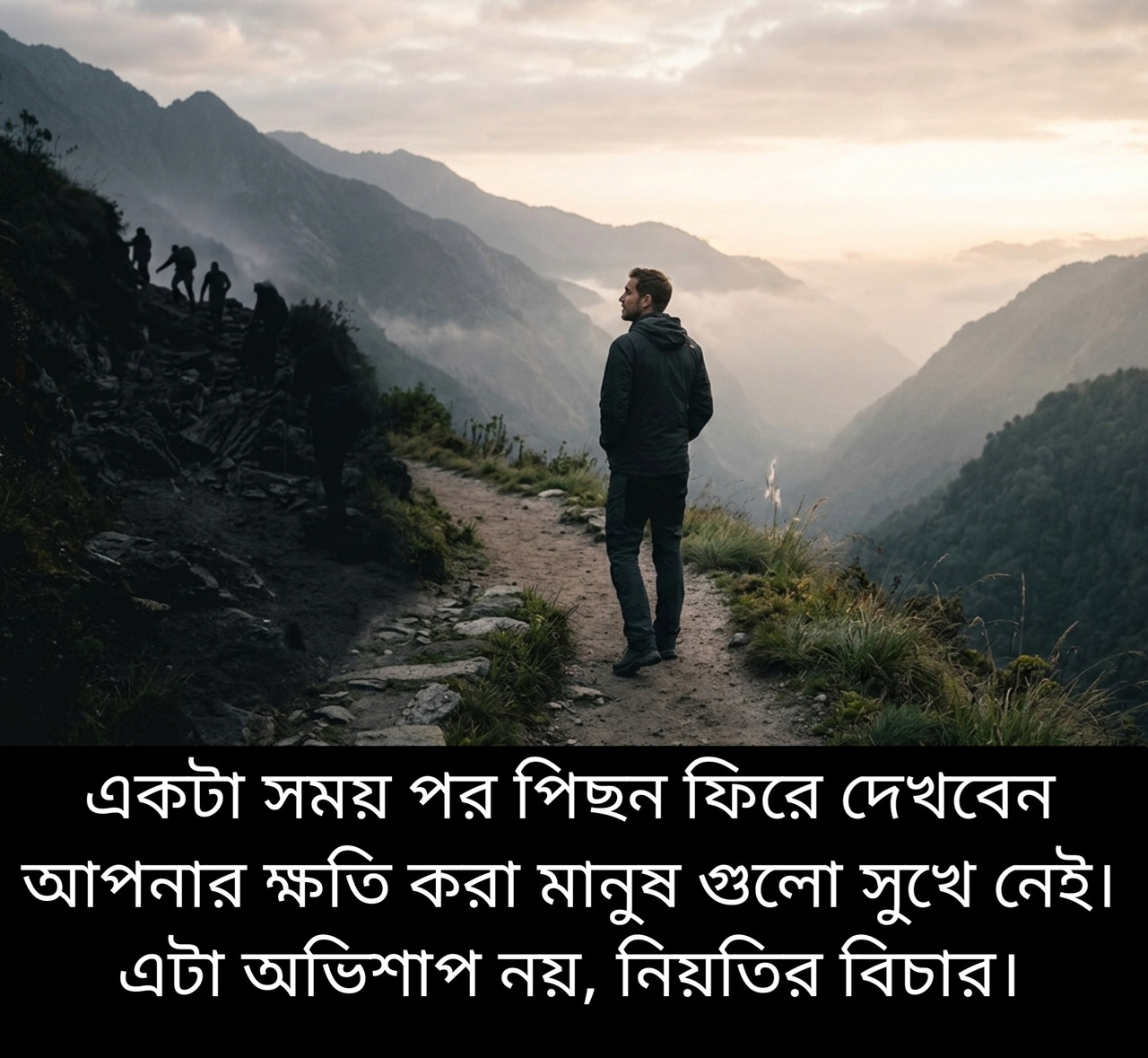হয়তো সেই মুহূর্তে মনে হয়, তারা জিতে গিয়েছে। কিন্তু বিশ্বাস রাখুন, সময় সবকিছুর হিসাব কষে। একটা সময় পর যখন আপনি অনেক পথ পাড়ি দিয়ে পিছন ফিরে তাকাবেন, তখন দেখবেন আপনার ক্ষতি করা সেই মানুষগুলো আজ আর সুখে নেই। তারা হয়তো সাময়িকভাবে হাসছে, কিন্তু ভেতরে ভেতরে নিয়তির কঠিন বিচারের মুখোমুখি তারা ঠিকই হচ্ছে।