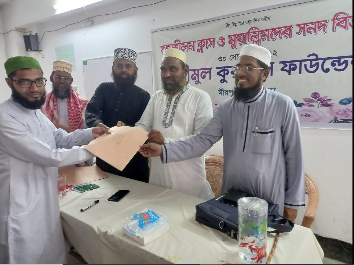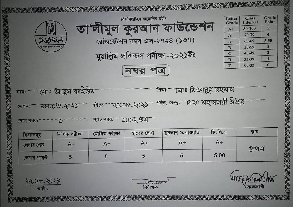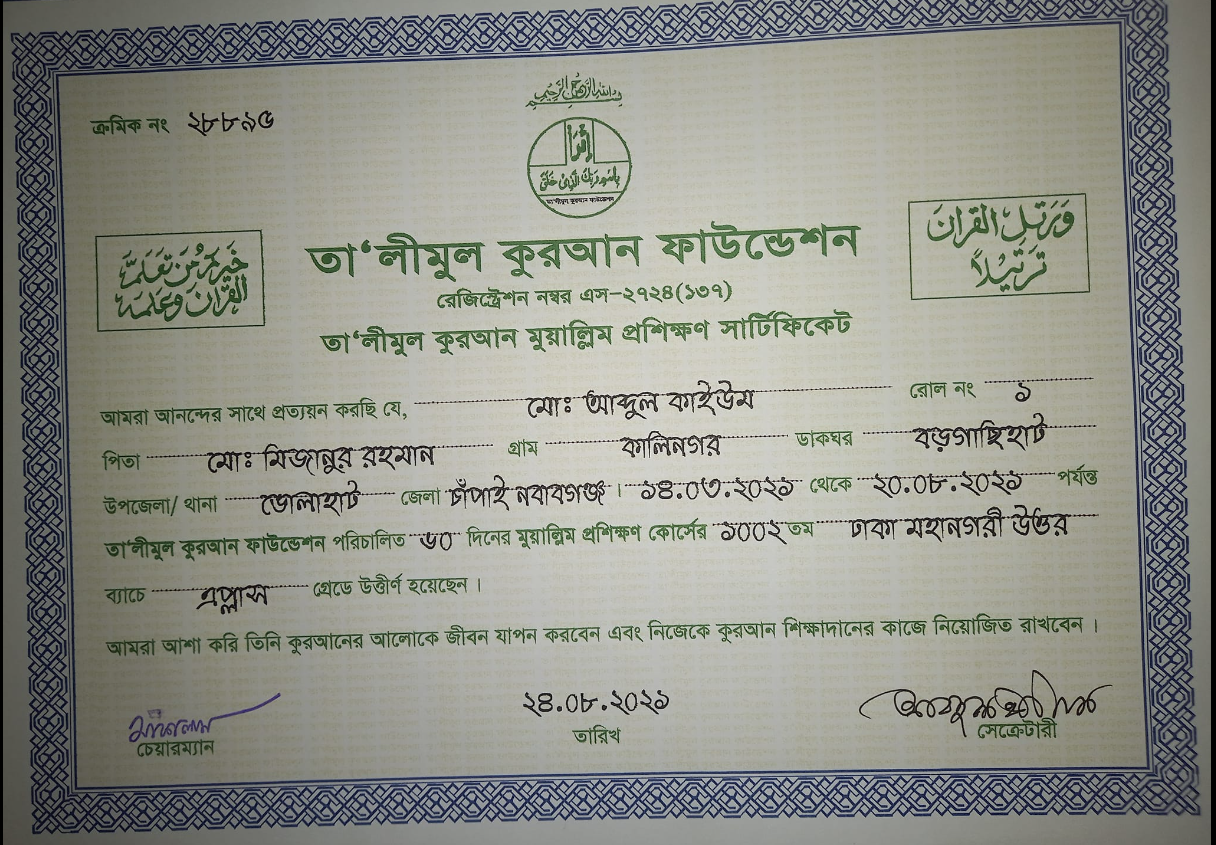 আলহামদুলিল্লাহ। তা'লিমুল কুরআন ফাউন্ডেশন কর্তৃক আয়োজিত ৬০ দিন ব্যাপী মুয়া'ল্লিম প্রশিক্ষণ কোর্সে অংশ গ্রহণ করে আজ সনদপত্র হাতে পেলাম। আমাদের ব্যাচে আমি ১ম স্থান অধিকার করেছি। মহান রবের তরে নত মস্তকে কৃতজ্ঞতা জ্ঞাপন করছি। সাথে সাথে আপনাদের নেক দোয়া কামনা করছি।
