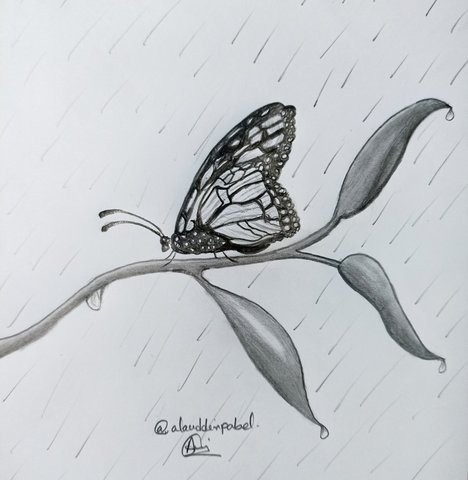 • আমার আরেকটি খুবই প্রিয় চিত্রাংকন এর মধ্যে একটি। বৃষ্টির দিনে একটি গাছের ডালে একটি প্রজাপতি বসে থাকার যে দৃশ্যটি আমি অঙ্কন করেছি, আশাকরি আপনাদের কাছে এই অংকটি খুবই ভালো লেগেছিল।