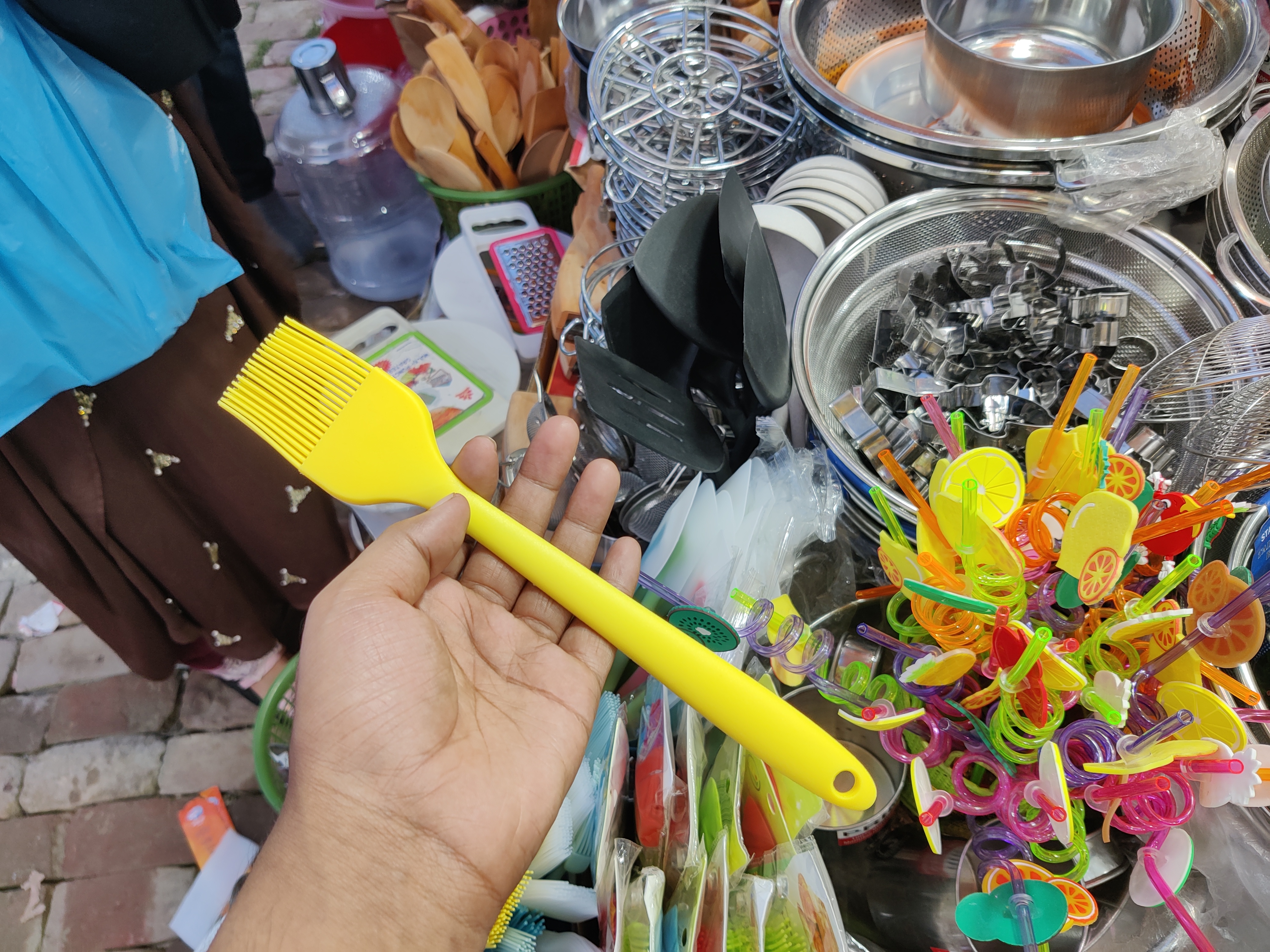 শুরুতে অনেক স্টল ঘোরাঘুরি করা হলেও কিছু কেনা হয়নি এবার কিছু জিনিসপত্র কেনার জন্য আবারো কয়েকটি স্টলে গেলাম। ওখানে একটি ইন্ডিয়ান স্টল ছিল। যেখানে সবজি কাটার এবং পেঁয়াজ কাটার বিক্রি করছিল। ওখান থেকে এক সেট নিলাম। মূল্য ৭০০ টাকা নিল। এরপর অন্য আরেকট স্টল থেকে একটি অয়েল ব্রাশ নিলাম। কারন বাসায় মাঝে মাঝেই গ্রিল বানানো হয়। গ্রিল বানানোর জন্য খুবই কাজে লাগে এই ব্রাশটি। এরপর টুকিটাকি আরো কয়েকটি জিনিস নিলাম প্লাস্টিকের।
