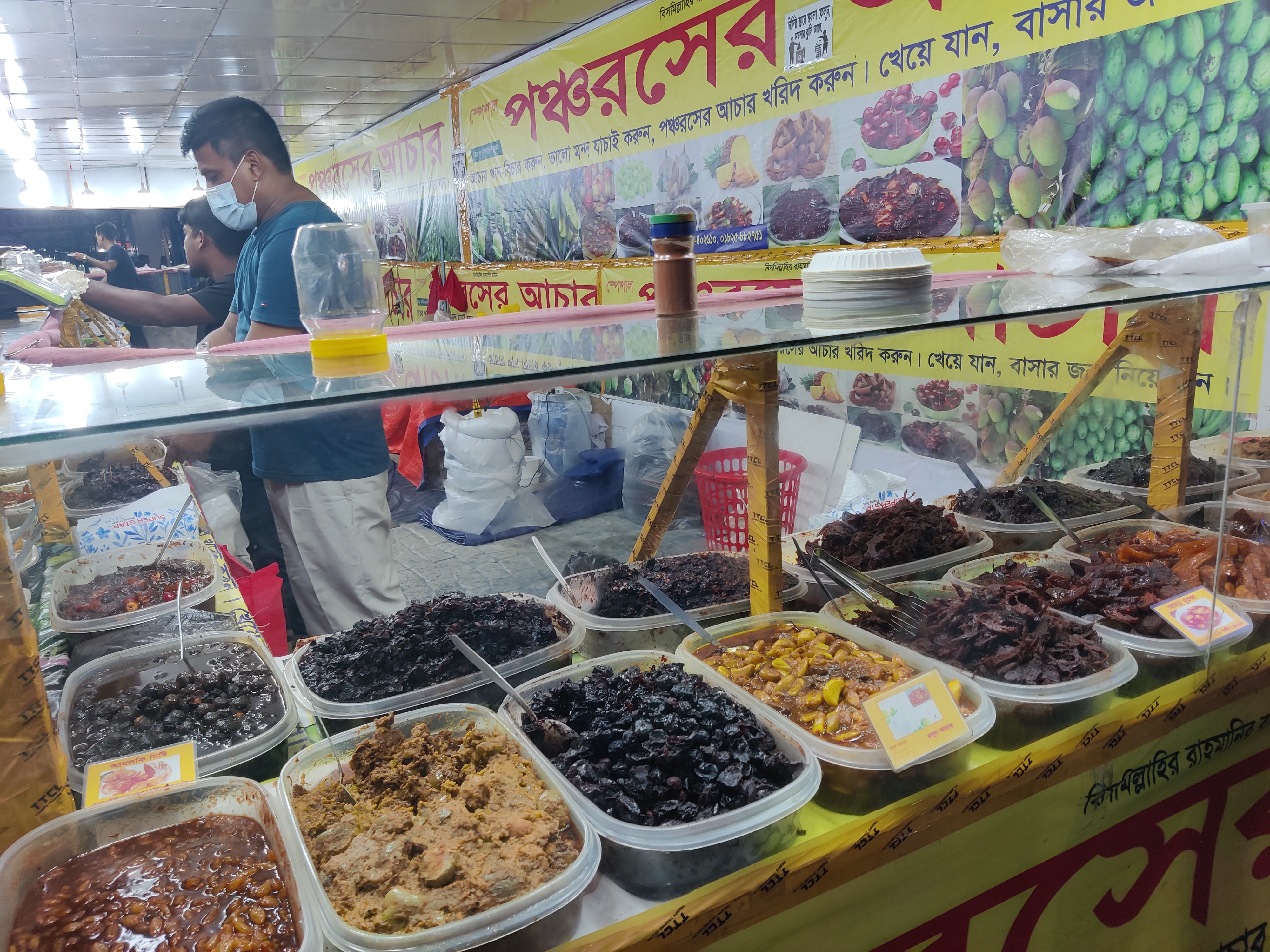 এরপর মেলায় সবচেয়ে আকর্ষণীয় স্টল পঞ্চরসের আচারের স্টলে গেলাম। ওখানে মোটামুটি সব ধরনের আচারই পাওয়া যায়। ওখানেই আমি রসুনের আচার টি টেস্ট করলাম। বেশ ভালই লাগল।