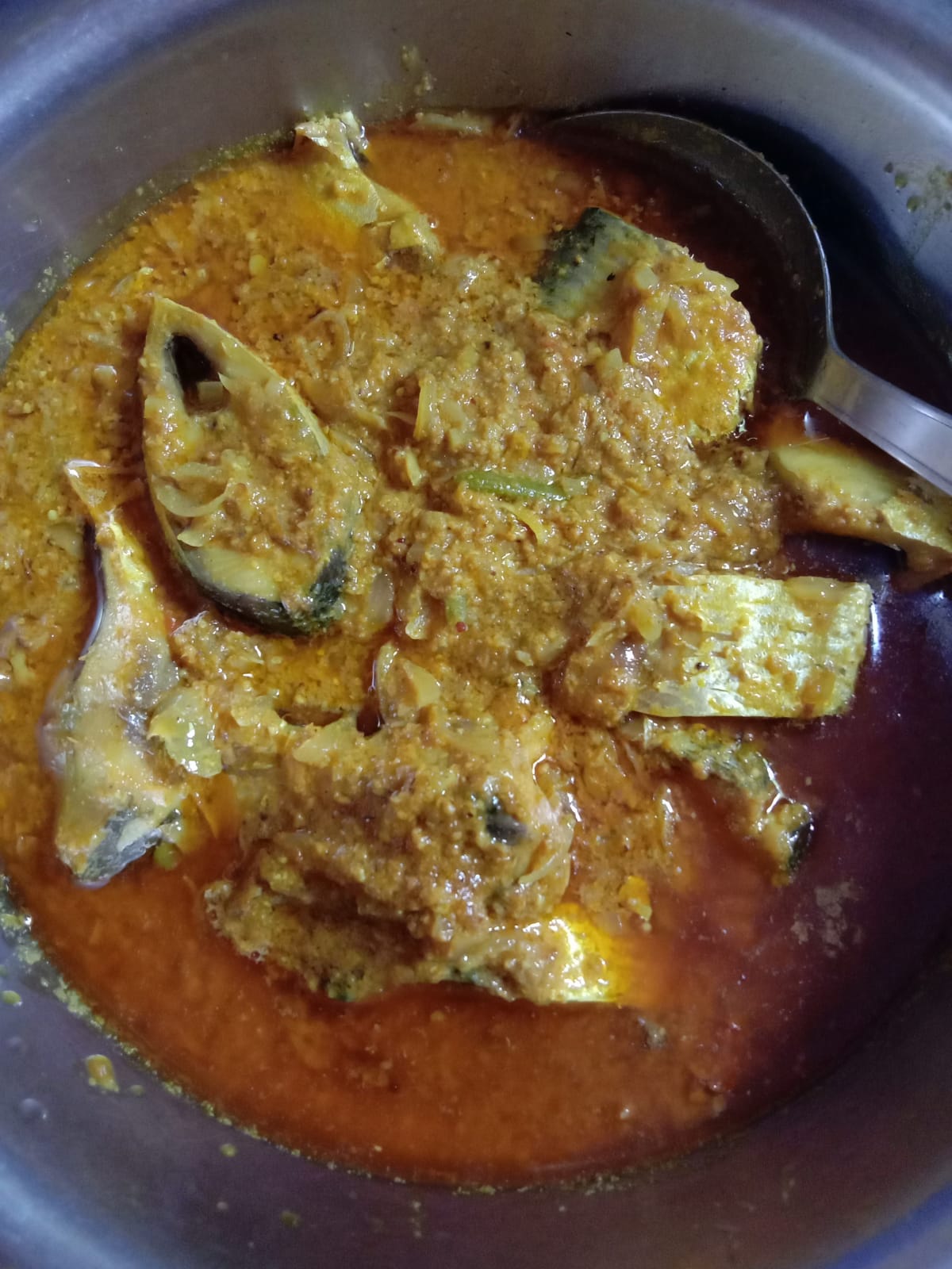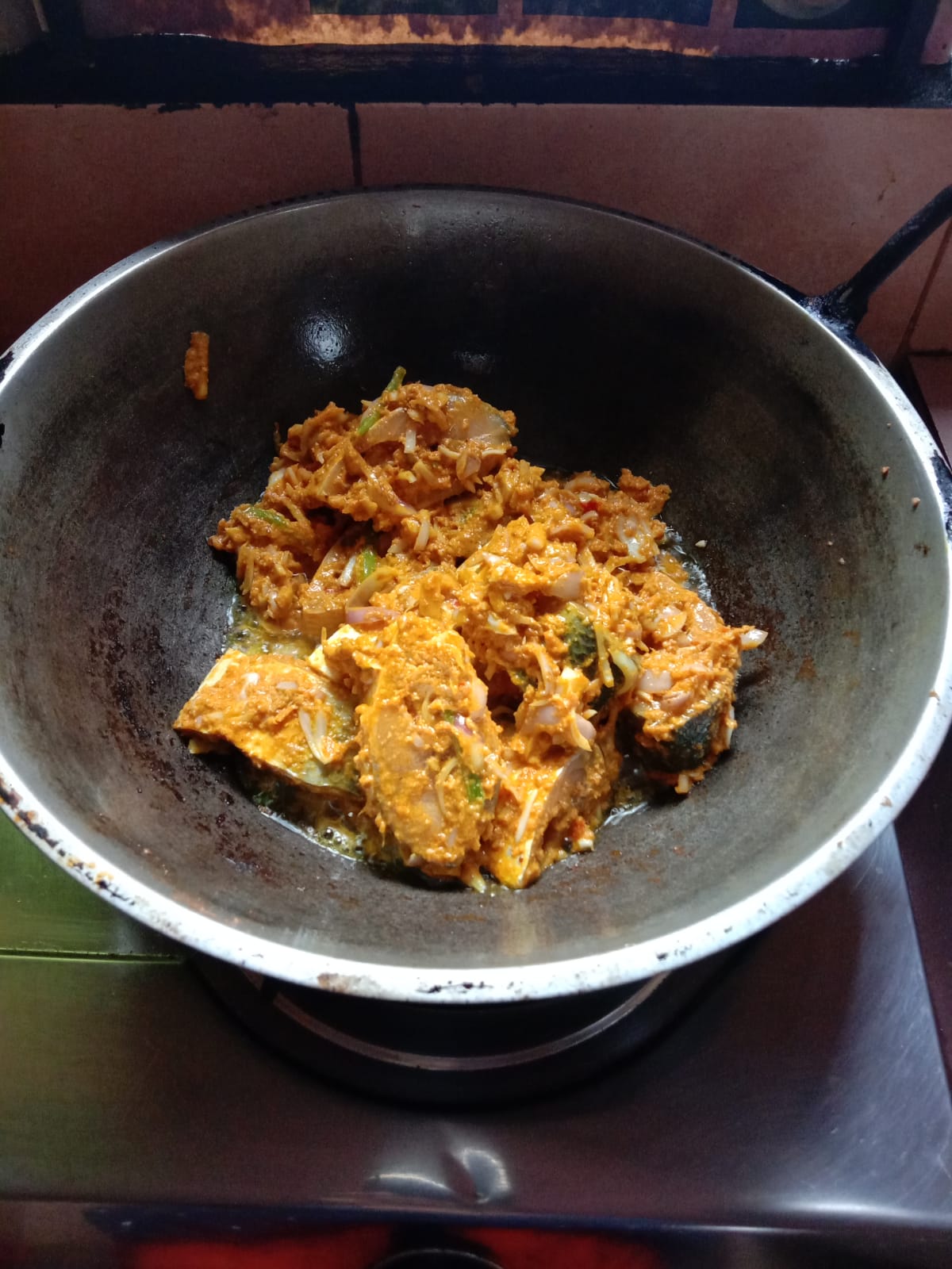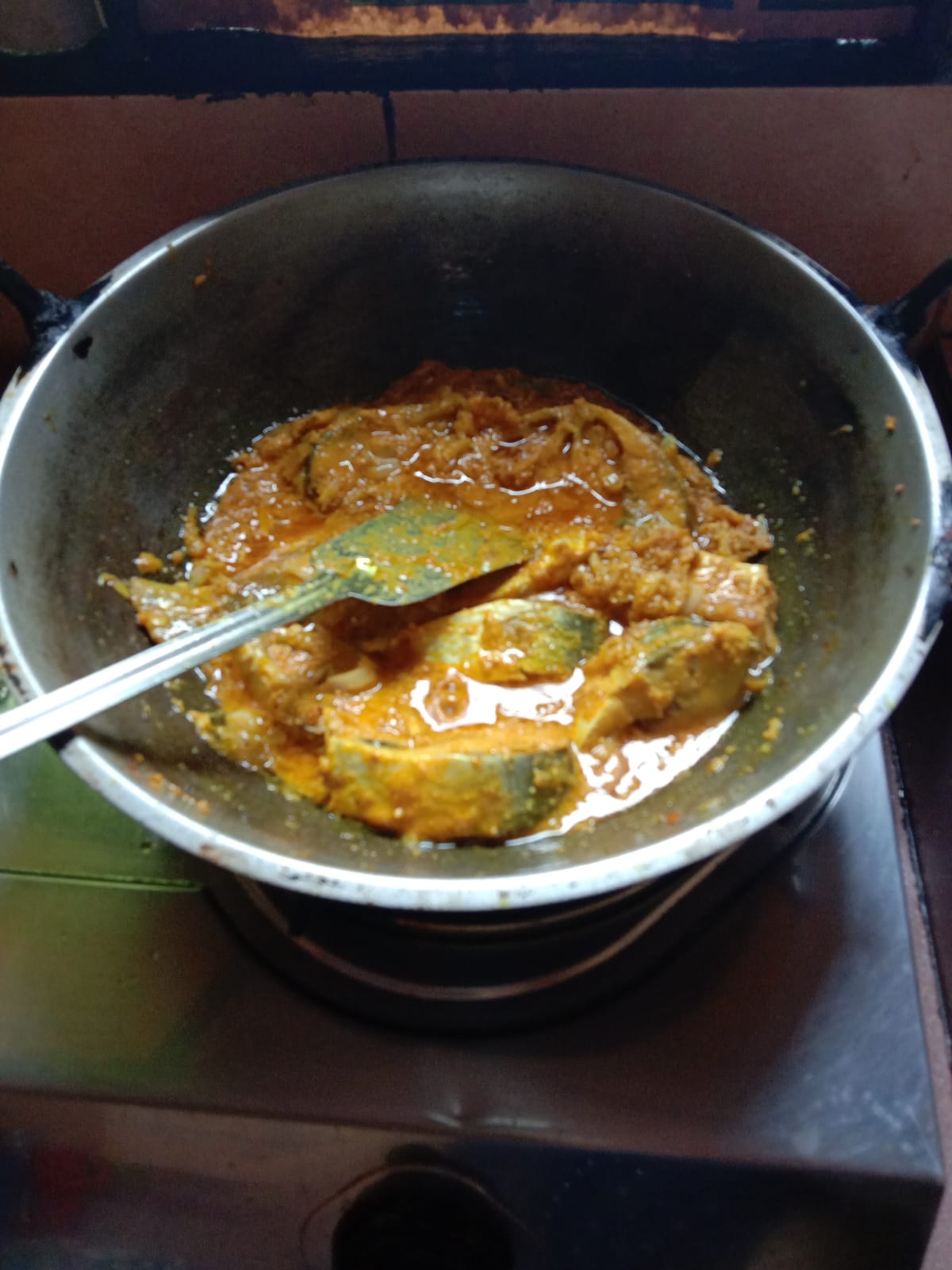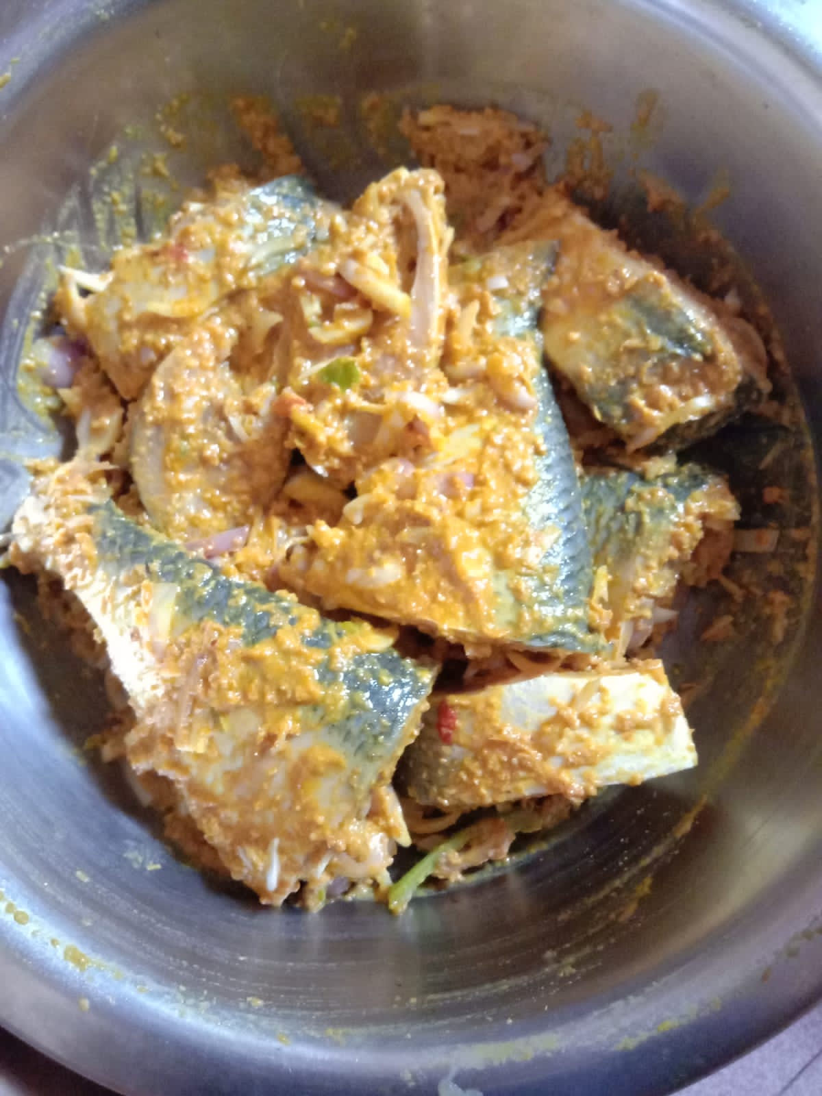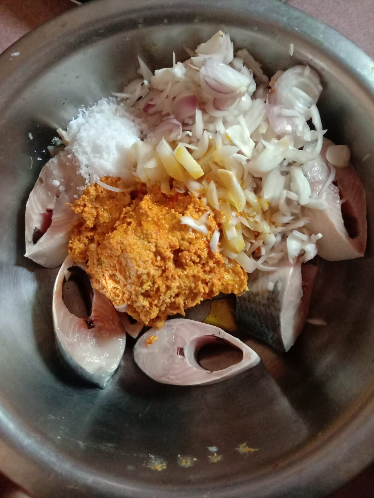 ১টি কড়াই নিয়ে তাতে ৩ টেবিল চামুচ সরিষার তেল দিয়ে গরম হওয়া পর্যন্ত অপেক্ষা করবো।গরম হয়ে গেলে তাতে পেঁয়াজ কুচি দিয়ে বাদামি হওয়া পর্যন্ত অপেক্ষা করবো।বাদামী রং ধারণ করে হয়ে গেলে তাতে মসলা দিয়ে মেখে রাখা মাছ গুলো ভালো করে কসায় নিতে হবে।