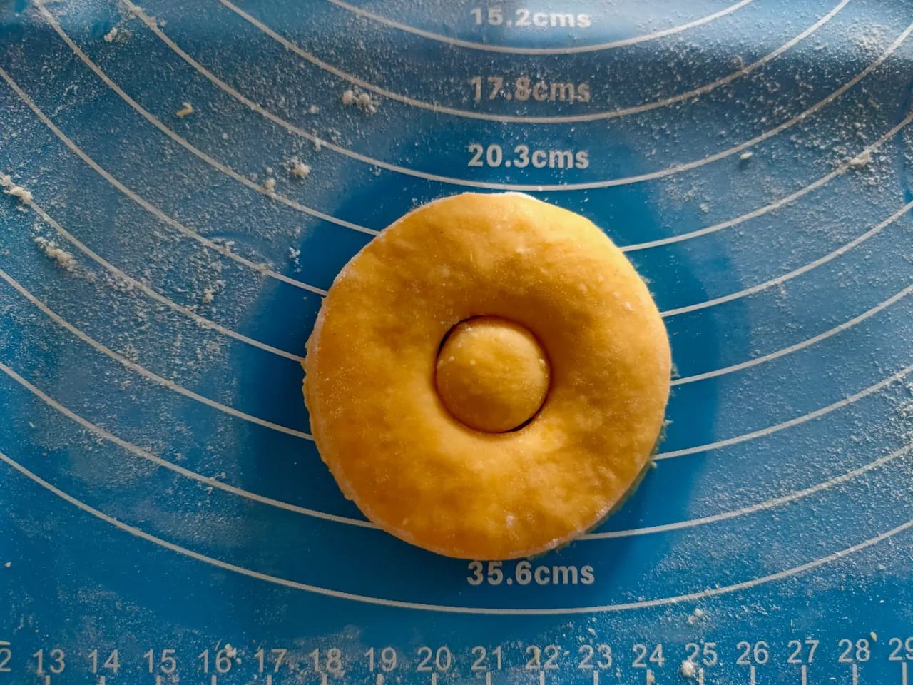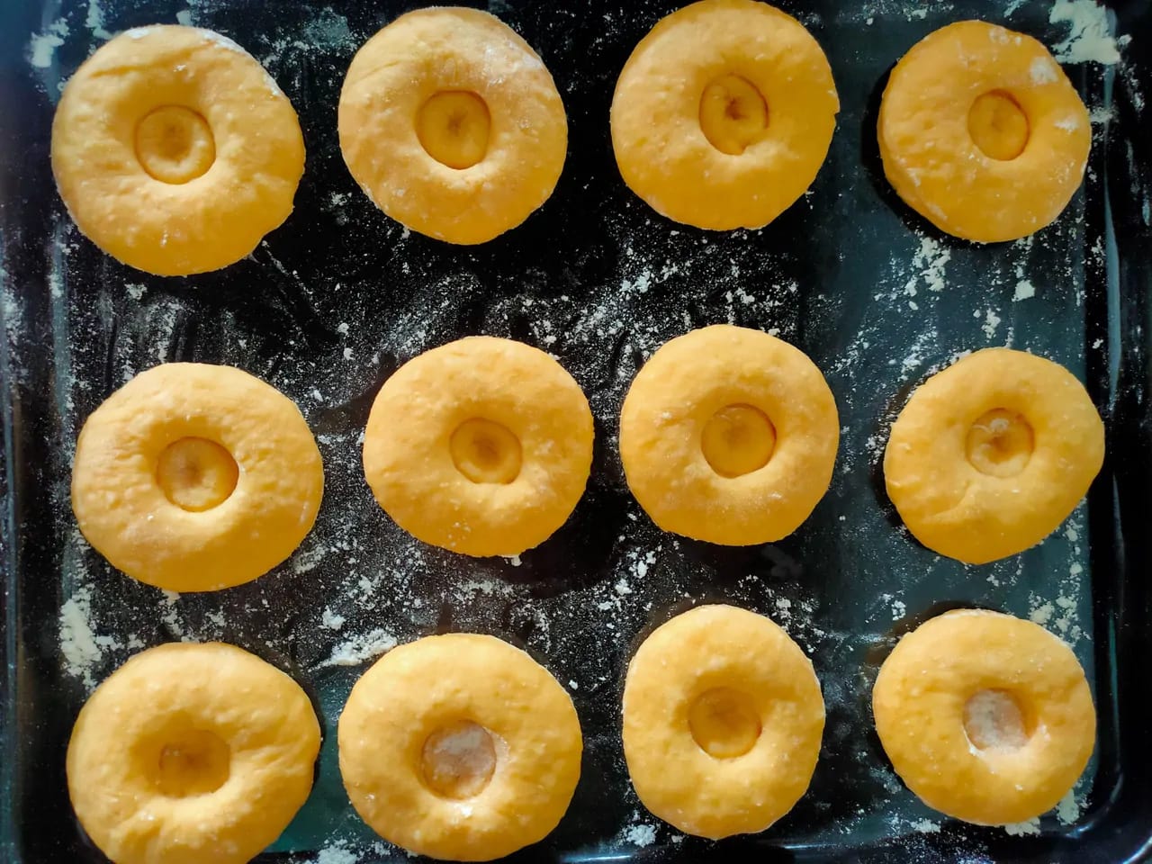 দশম ধাপ, ময়দার আকৃতি ডোনাটের মতো হয়ে যাওয়ার পরে, এখন এটি একটি বড় বেকিং শীটে স্থানান্তর করুন এবং বেকিং শীটে ময়দা ছিটিয়ে দিতে ভুলবেন না যাতে ময়দা লেগে না যায়। তারপর, কেন্দ্রে সামান্য চাপ দিন যাতে আমরা ডোনাটের মাঝখানে গলানো চকোলেট রাখতে পারি। তারপরে, একটি পরিষ্কার কাপড় দিয়ে ময়দাটি ঢেকে দিন এবং 10 বা 15 মিনিটের জন্য ময়দাটি দ্বিগুণ হতে দিন।