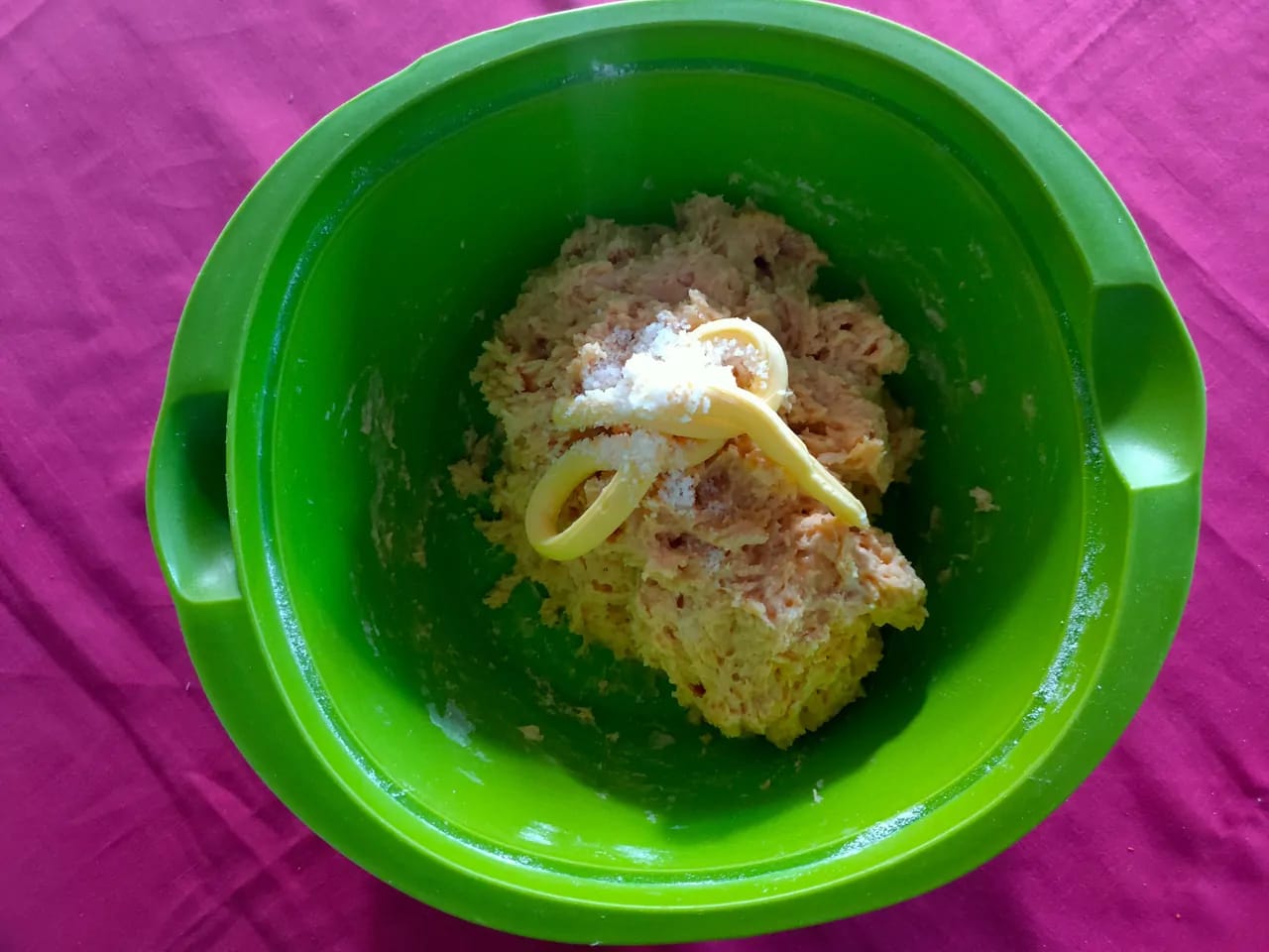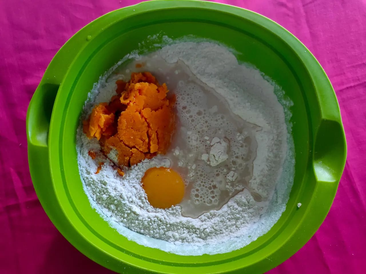 পঞ্চম ধাপে, শুকনো মিশ্রণটি ভালভাবে মিশে যাওয়া পর্যন্ত নাড়ার পর, এখন যা বাকি থাকে তা হল ম্যাশ করা হলুদ মিষ্টি আলু, 1 ডিমের কুসুম এবং পর্যাপ্ত খনিজ জল। তারপর, হাত দিয়ে ময়দা মাখুন বা আপনি একটি মিক্সার ব্যবহার করতে পারেন যতক্ষণ না ময়দা অর্ধেক মসৃণ হয়।