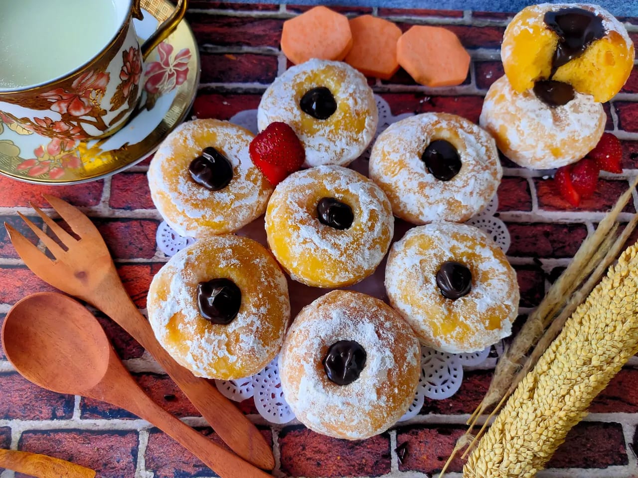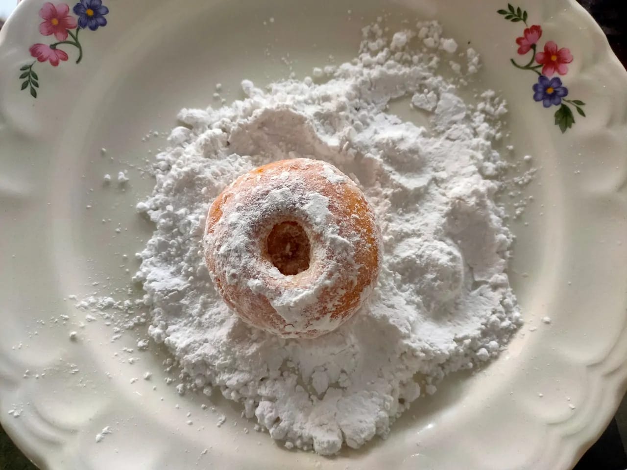 শেষ ধাপে, সমস্ত ডোনাট শুকিয়ে যাওয়ার পরে, এখন প্লেটে গুঁড়ো চিনি প্রস্তুত করুন এবং সমস্ত ডোনাটগুলিকে গুঁড়ো চিনিতে সমানভাবে ছিটিয়ে দিন। তারপরে, ডোনাটের মাঝখানে, পছন্দমতো গলিত চকোলেট বা অন্যান্য চকলেট যোগ করুন।
