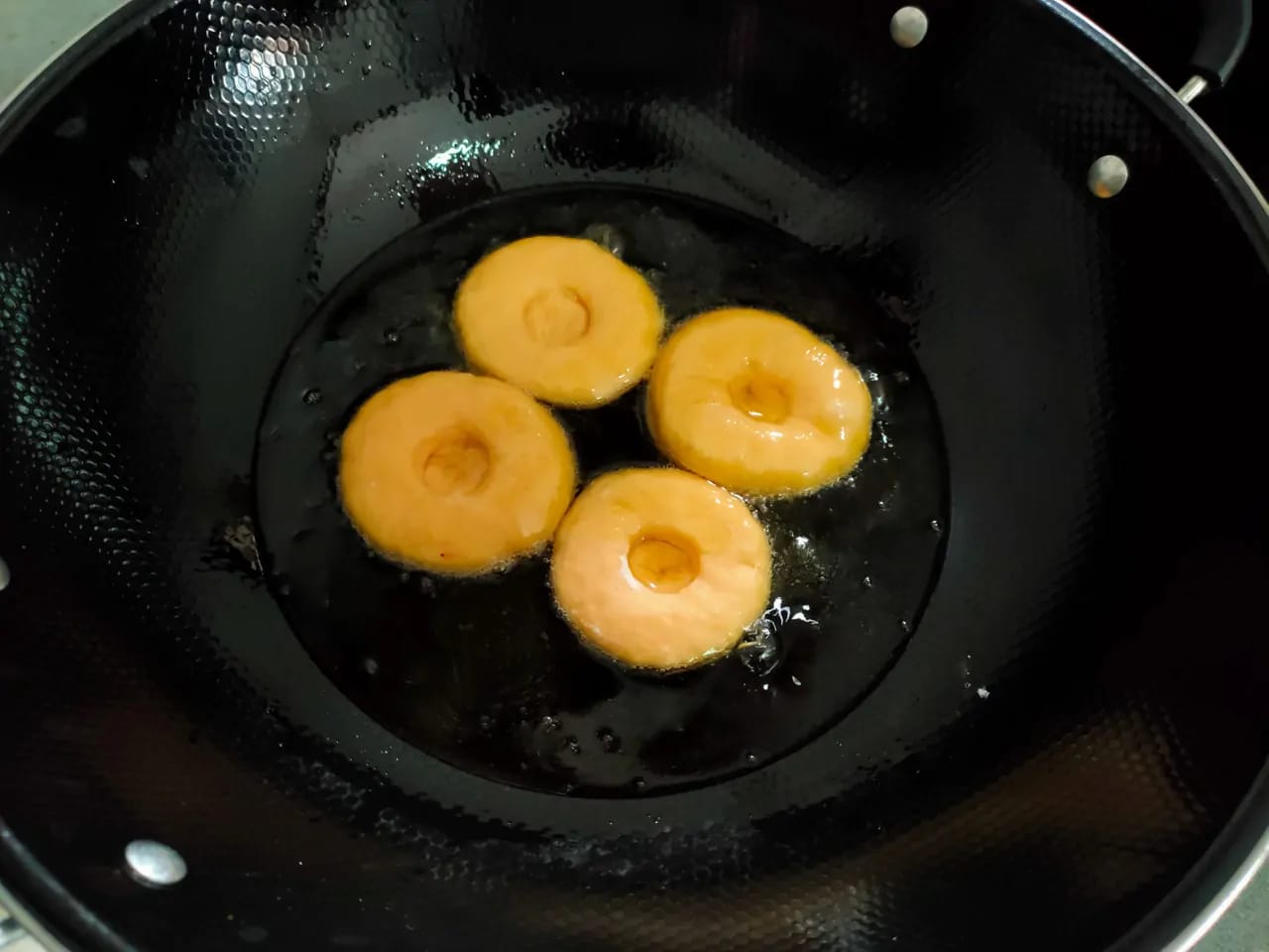 একাদশ ধাপ, সব হয়ে গেলে, একটি ফ্রাইং প্যান তৈরি করুন এবং প্যানে পর্যাপ্ত রান্নার তেল দিন। তারপরে, রান্নার তেল সত্যিই গরম হওয়া পর্যন্ত গরম করুন। এর পরে, ডোনাটগুলি একে একে ভাজুন যতক্ষণ না উভয় দিক বাদামী হয়। ভাজা ডোনাটগুলি ড্রেন করতে ভুলবেন না যাতে কোনও রান্নার তেল লেগে না যায়।