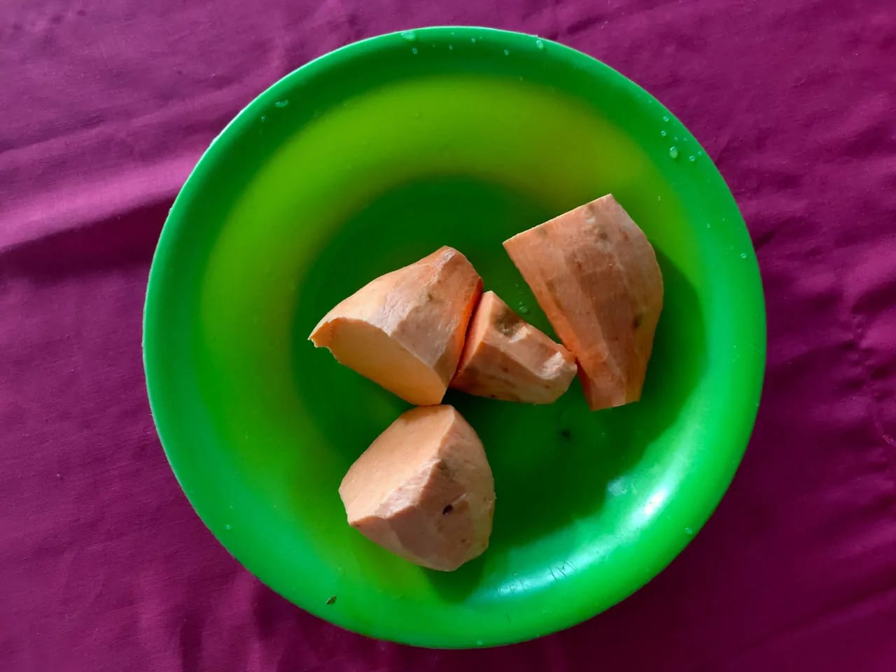 প্রথমে আপনাকে যা করতে হবে তা হল আপনার পছন্দ অনুযায়ী কিছু হলুদ মিষ্টি আলু প্রস্তুত করুন, তারপর হলুদ মিষ্টি আলু খোসা ছাড়িয়ে পরিষ্কার করুন। তারপরে, উপরের ছবির মতো হলুদ মিষ্টি আলুকে কয়েকটি অংশে কেটে নিন।