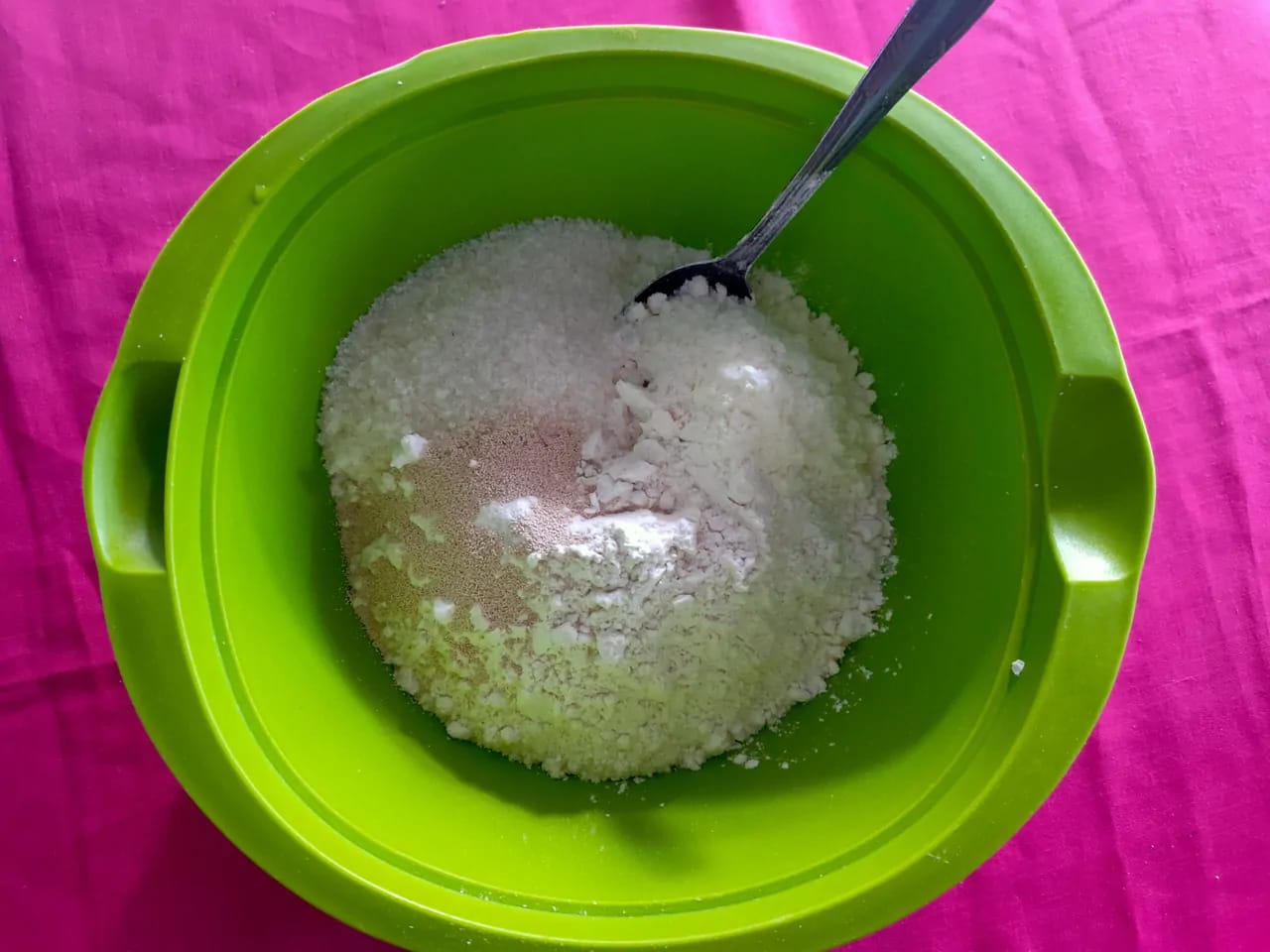 চতুর্থ ধাপ, হলুদ মিষ্টি আলু আলাদা করে রাখার পর, এখন একটি জায়গা তৈরি করুন এবং 15 টেবিল চামচ ময়দা, 5 টেবিল চামচ চিনি, 1 প্যাকেট গুঁড়ো দুধ, আধা টেবিল চামচ খামির যোগ করুন। তারপরে, শুকনো মিশ্রণে নাড়ুন যতক্ষণ না ঠিক একত্রিত হয়।