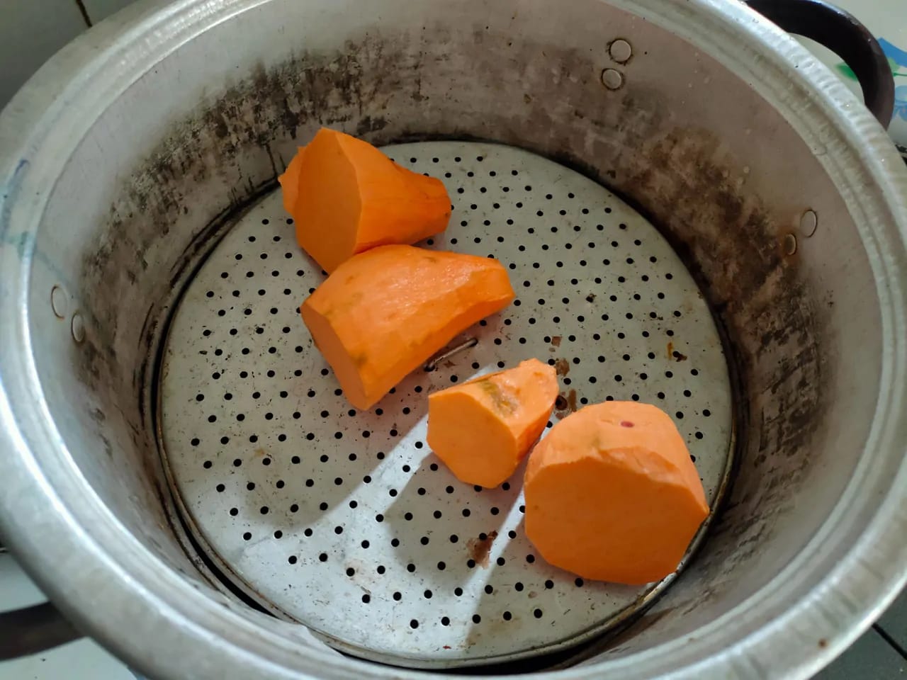দ্বিতীয় ধাপে, হলুদ মিষ্টি আলু খোসা ছাড়ানো, পরিষ্কার এবং টুকরো টুকরো করে ফেলার পরে, এখন স্টিমার প্রস্তুত করুন এবং স্টিমারে হলুদ মিষ্টি আলুর টুকরোগুলি রাখুন। তারপরে, হলুদ মিষ্টি আলুটি নরম হওয়া পর্যন্ত বাষ্প করুন এবং শুধুমাত্র মাঝারি আঁচে রান্না করুন।