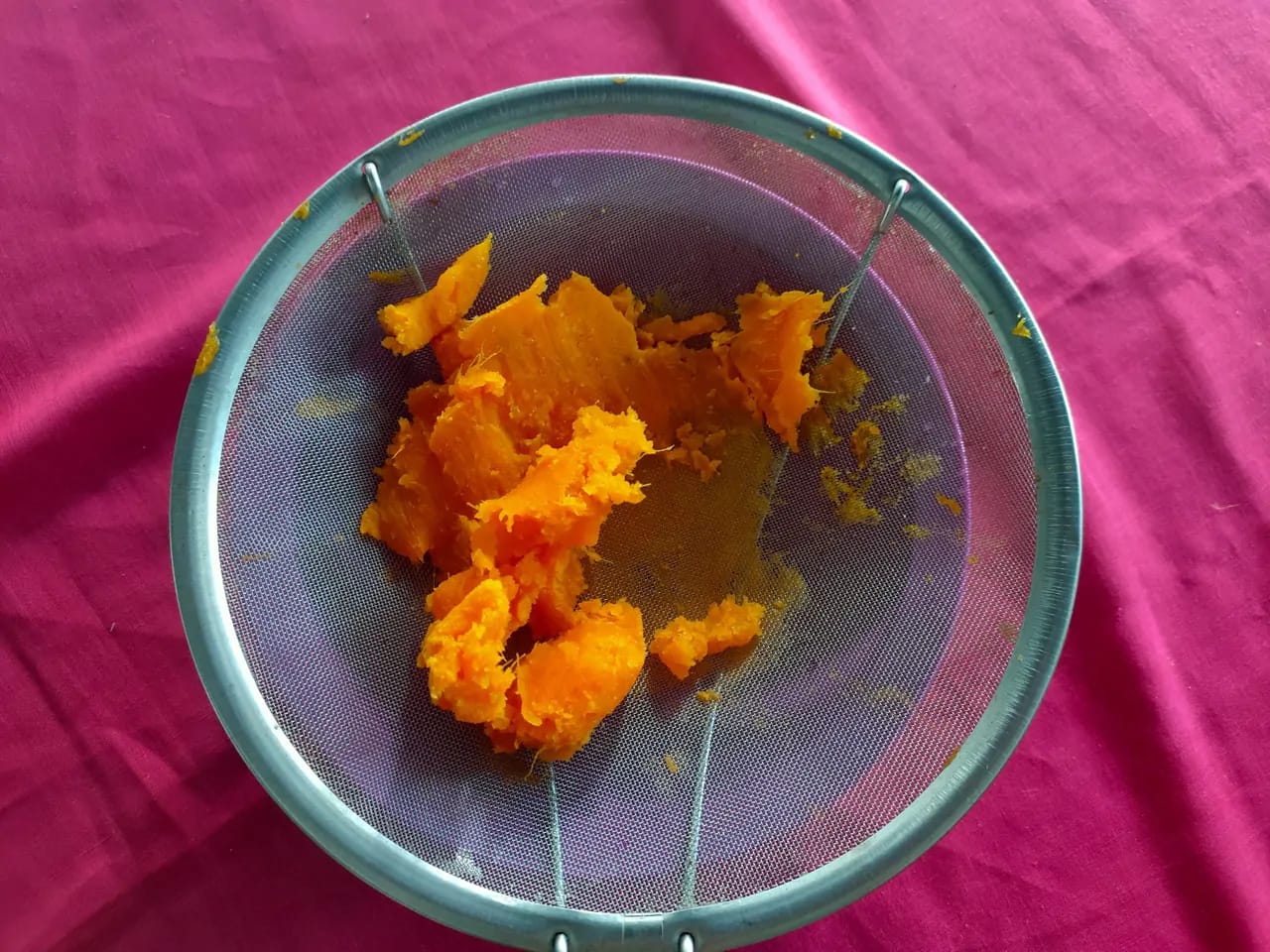 তৃতীয় ধাপে, মিষ্টি আলু সিদ্ধ হওয়া পর্যন্ত স্টিম করার পর এবং সত্যিই নরম হওয়া পর্যন্ত, এখন চামচ বা কাঁটাচামচ ব্যবহার করে একটি চালুনিতে চেপে হলুদ মিষ্টি আলু পিউরি করুন। তারপর প্রথমে হলুদ মিষ্টি আলু আলাদা করে রাখুন।