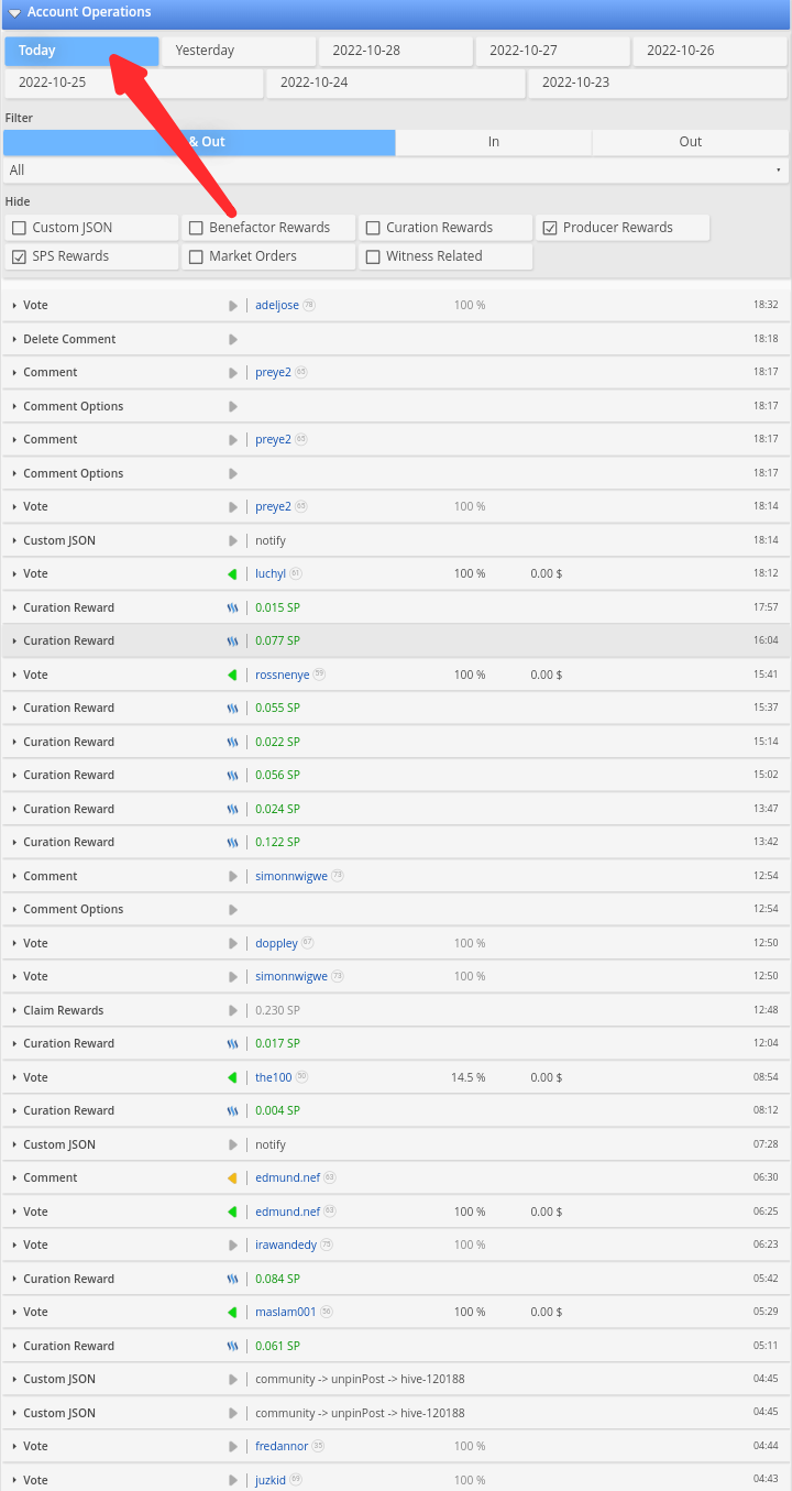 You then click on the today to check the activity for today or the previous days. Every activities that happened in the account will appear here. Everything will appear here apart from the mention and the resteem will not appear here.