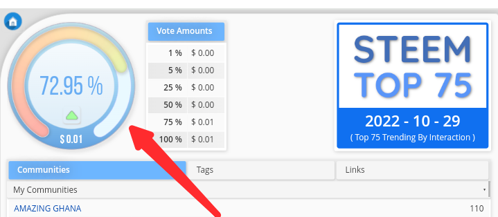 And after the first step this is what you will see, a new page with different view or different features. What the arrow is pointing to is the voting power percentage and the owner has been using it that is why it is around 73%, because it supposed to be 100%. And under it we have $0.01, this is the amount of vote the person using this account can give and it is mostly depends on the amount of steem power someone has on his or her wallet. And under it there is also communities, tags and links. The communities there is the number of communities that an individual have subscribed to. Tags are the particular tags that a person can use during post preparation. The links are the other steemit tools in this tool.
