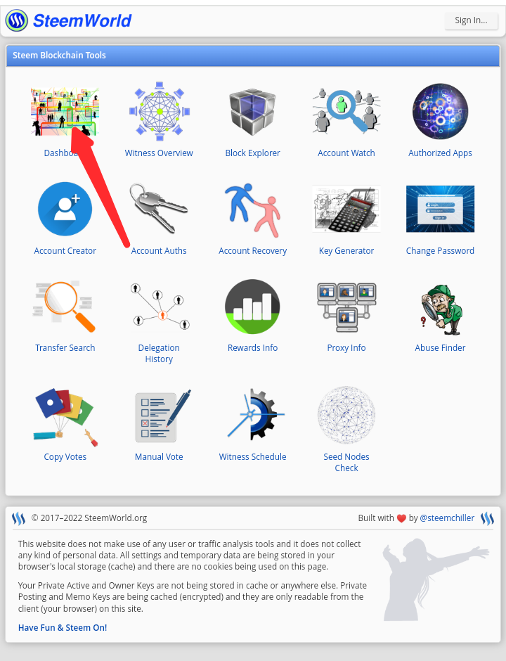 Search SteemWorld in any browser that you are using or type www.steemworld.org and you will see what you are seeing below. SteemWorld was built by @steemchiller and because of that you will always say his user name in the this tool. And when it opens like this you click on the dashboard at where the red arrow is pointing to in the picture one below. And it will load and open another page in the picture picture two below.