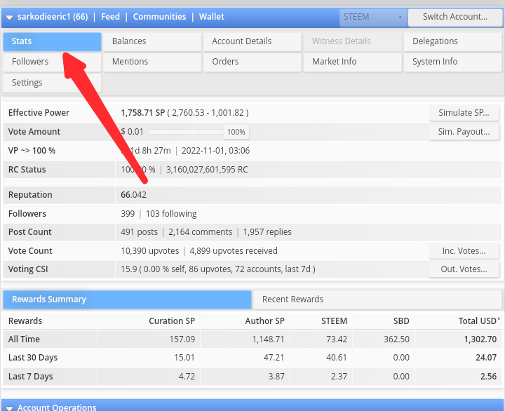 And when it load, something like this will appear and you click on the stats. To see the statistics of your your account. Then you check your activity on steemit.