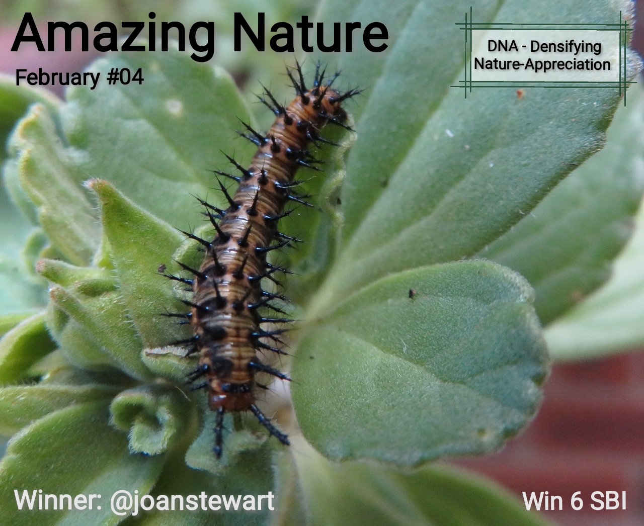 This weeks winner of the contest is @joanstewart with her entry about the nearly complete metamorphosis cycle of the Nymphalidae. It all started with a little caterpillar that she found on her lobster flower in the garden, eating it up slowly. Shortly after that he already started wrapping up into a pupa in just a couple of hours. Then, after a bit more than a week, finally a beautiful butterfly emerged to freedom. Her post is really beautiful one that, in addition, is full of details and explanations. So if you are interested in more, just give it a look. Thank you very much for your great and amazing entry Joan!