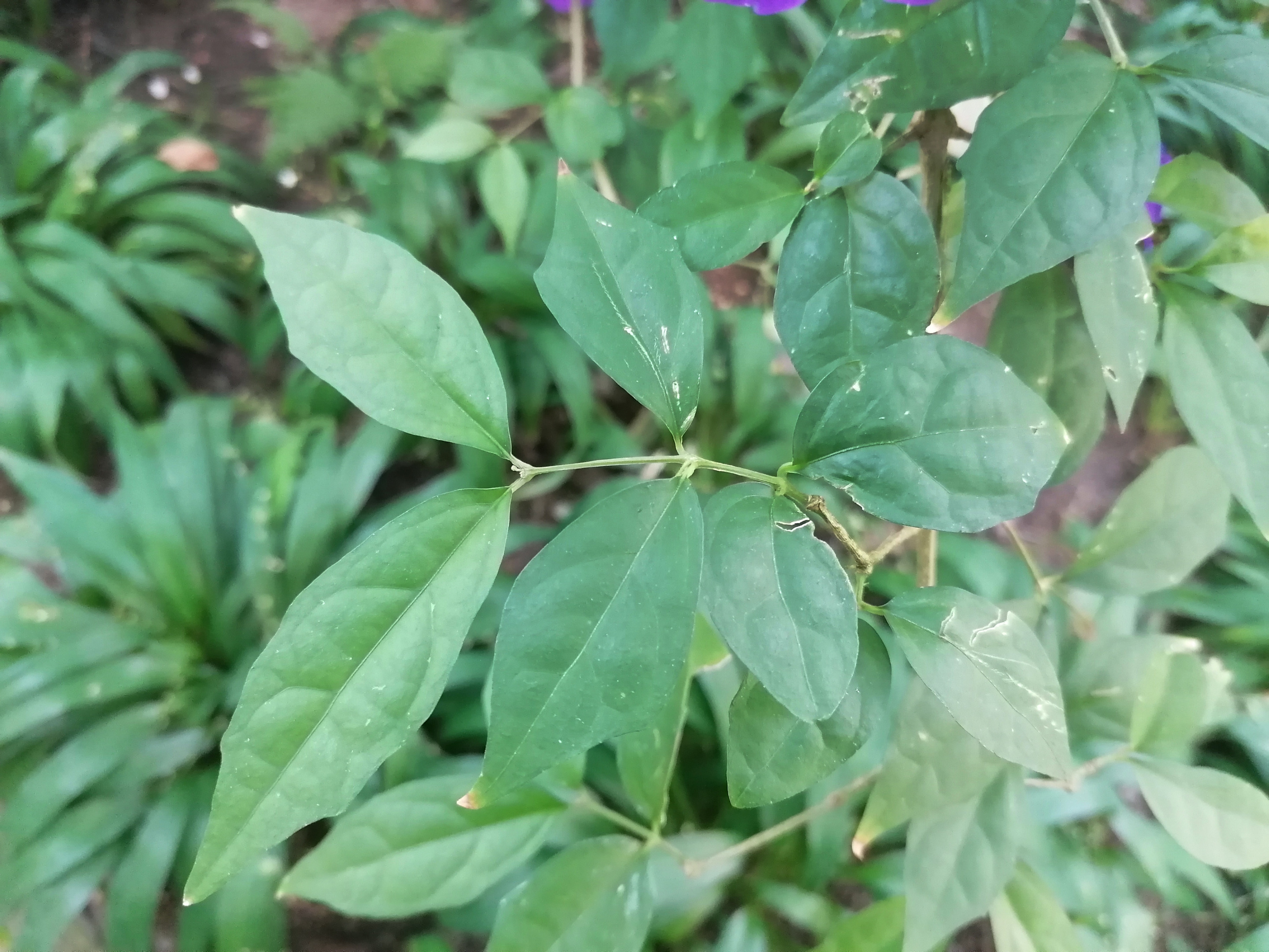 The Leafs of the Thunbergia are arranged in an opposite fashion and shaped elliptic. They are yellowish-green when still young and become medium green and acuminate at the tips when they become mature. In this case they can get as long as 4 cm.