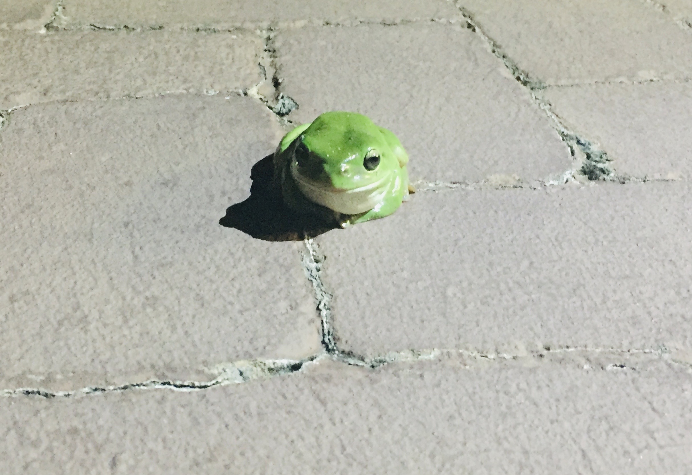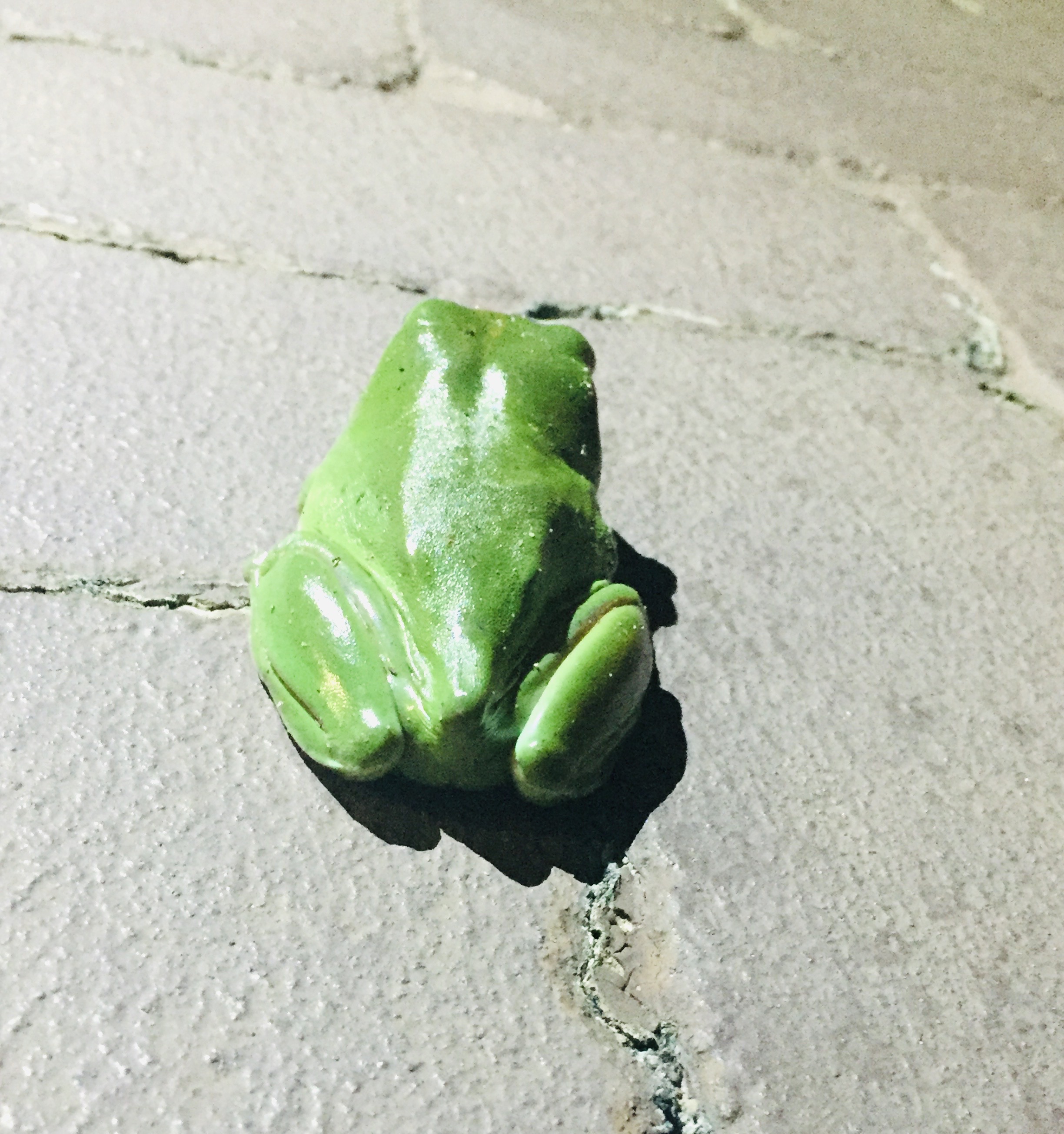 This little green frog did not make a grand appearance like the possum who rang the door bell. This little fellow arrived very quietly and undercover sitting in the dark on the pavers out the front of our home. He was very stealth like. Thankfully I did not walk on him, they make a very loud noise when trodden on. And rightly so!