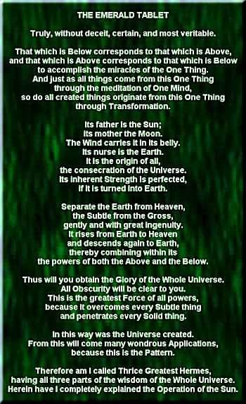 The Tablets have been described as rectangular green slabs or plaques with exquisite, bas-relief lettering. A lettering which appears similar to the ancient Phoenician script. And while the many translations over the centuries all source their origin from these carved emerald stones, the “original” objects are nowhere to be found … at least not to this day.