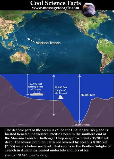 The MARIANA TRENCH is the deepest point of the Earth.But there are some secrets we will know today about that wonderful and pistursque beautiful place with utter suspenses hidden.Mariana Trench or Mariana's Trench is situated close to the Mariana beach of Pacific Ocean.It is 11 kms. deep inside the seabed and believed to be the deepest point of the earth.There are many expeditions inside Mariana Trench to find the secrets inside it.It is believed that it is the gap between two tectonic plates.But who lives in that great trench? The atmospheric pressure is 1000 times greater than normal atmospheric pressure.To everyone utter surprise the bacterias or other microscopic organisms which we struggle to see under a microscope grows in Mariana Trench but the size there are gigantic.Every animal born there are gigantic in size.There are molluscs,fungi and other small organism.It is still a mystery that how can those organisms with soft body live normally in the pressure where exerted pressure is not a normal one.Th biggest mystery is the living creature MEGALODON which is the biggest species of shark which became extinct centuries ago.But Japan,U.S.A. and Switzerland have confirmed an animal like that living in the Mariana Trench.As everything is gigantic,the pressure and other natural forces are believed to be the cause of this gigantism of organisms.Scientists have also discovered the gigantic jellyfish shaped like a alien and luminous body CROSSOTA in the Mariana Trench.The last mystery is though Mariana Trench is unfit to live or its impossible to access for a normal hu