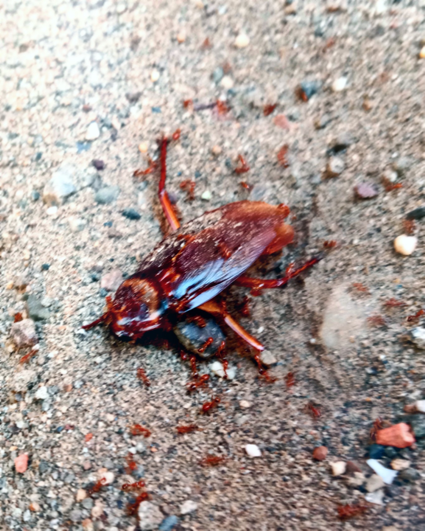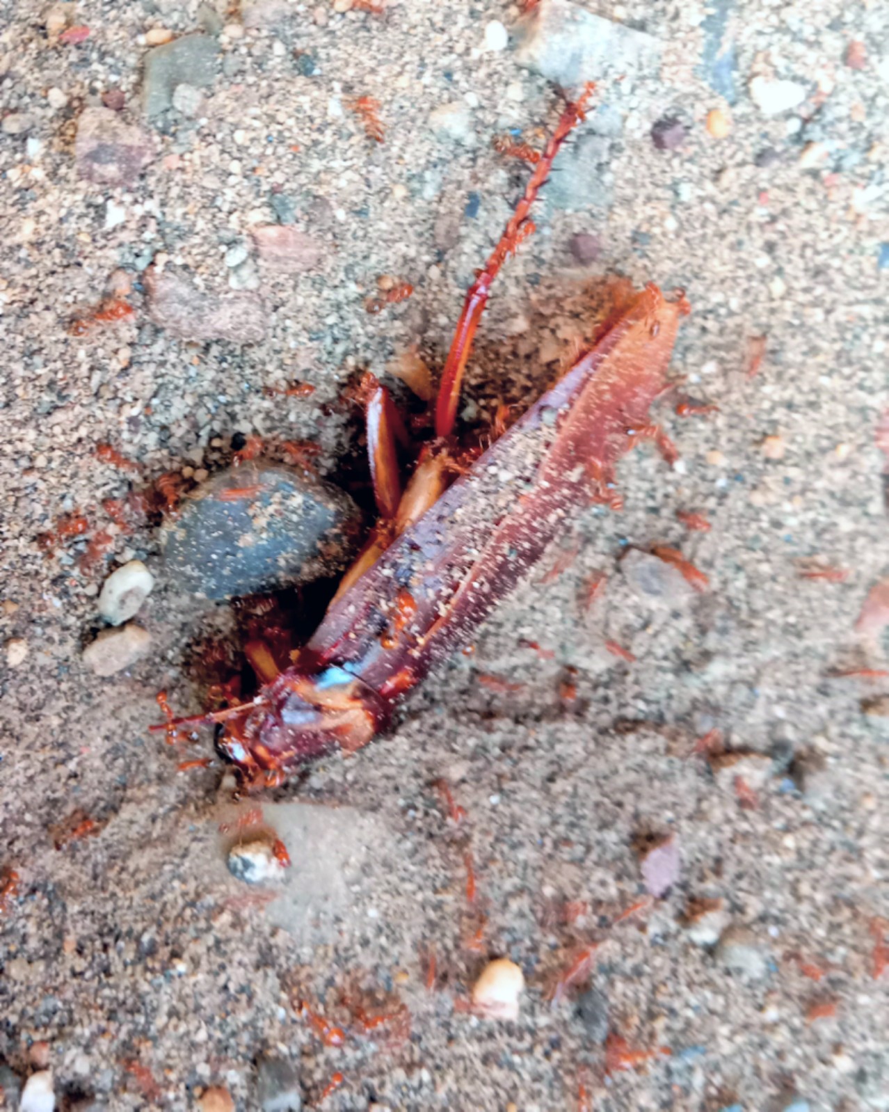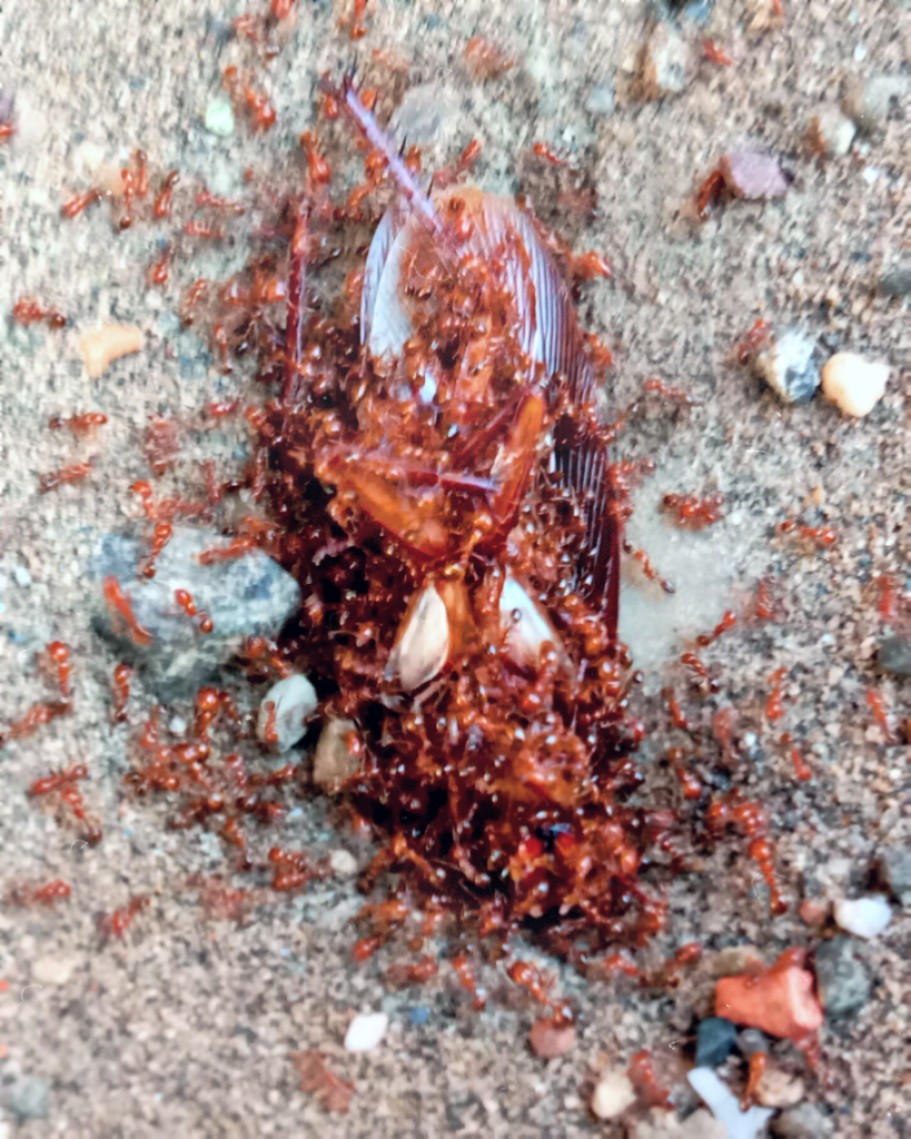 You can see it in the image how a cockroach is slaughtered with the strength of ants numbering in the hundreds, so that the legs and other parts have been separated from the body of the victim.
